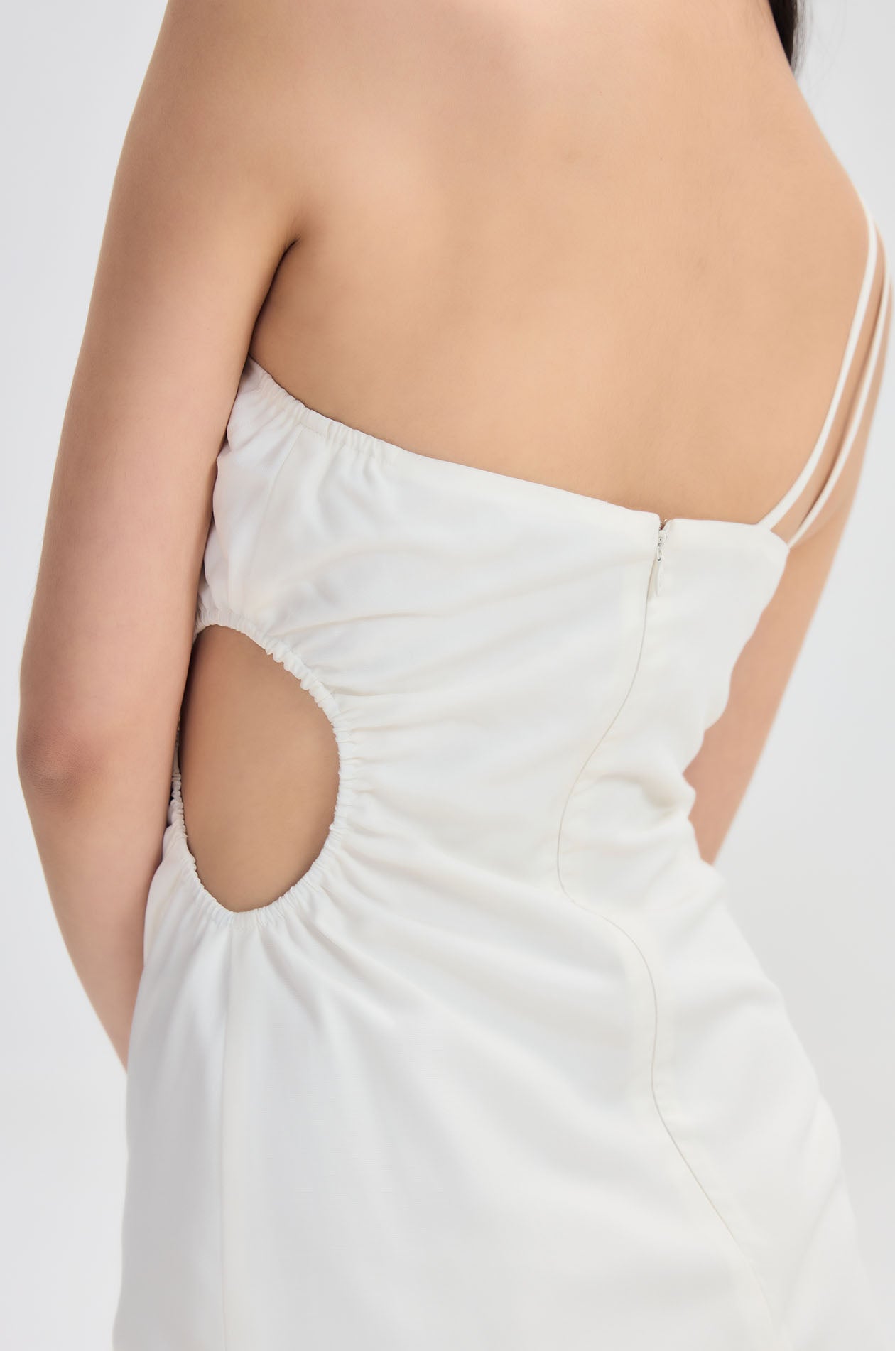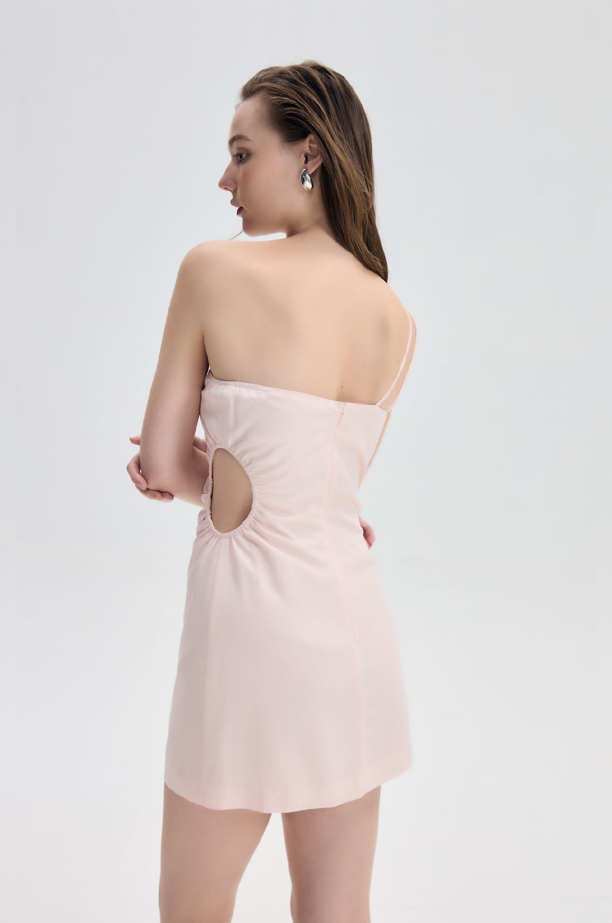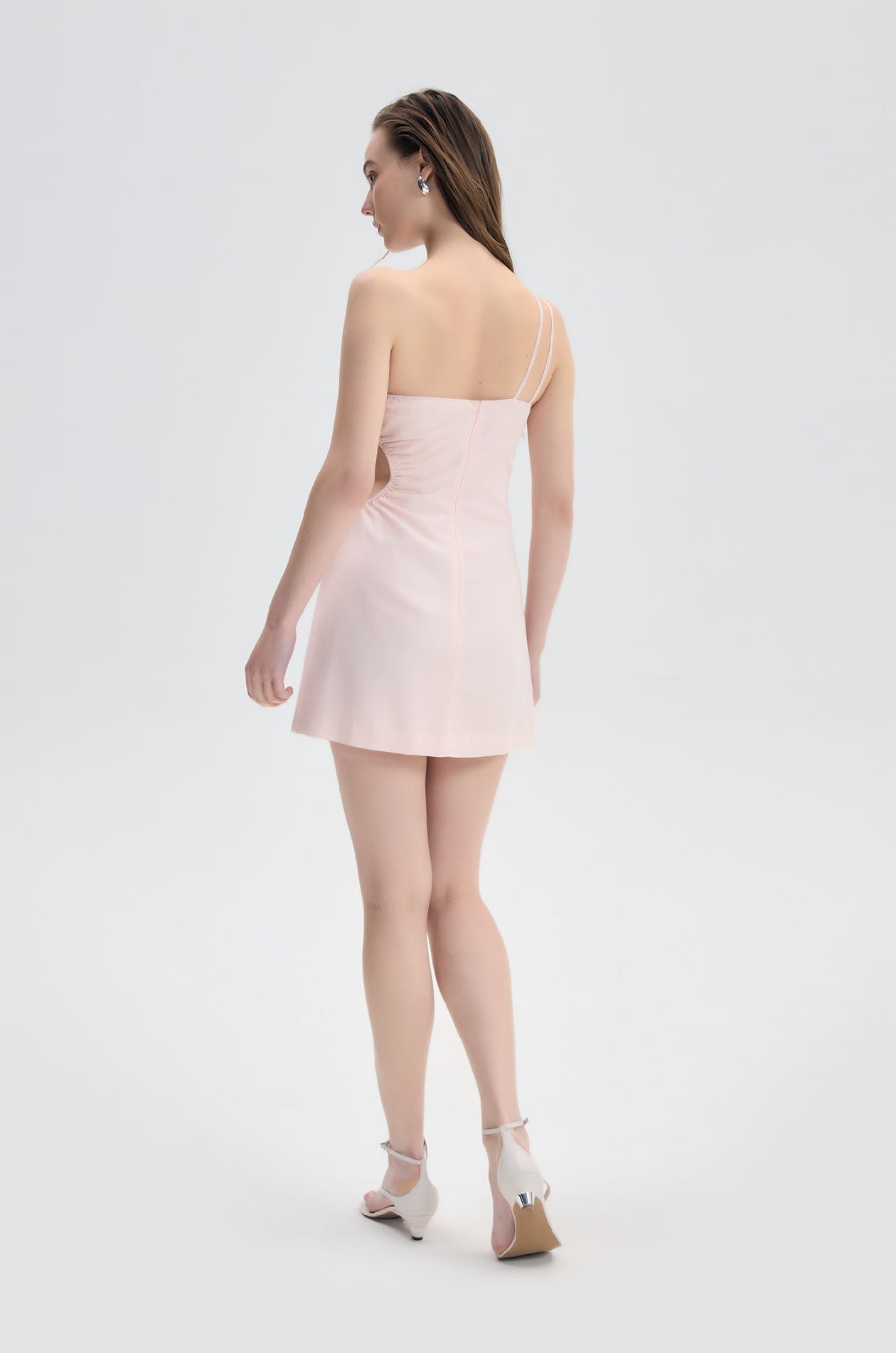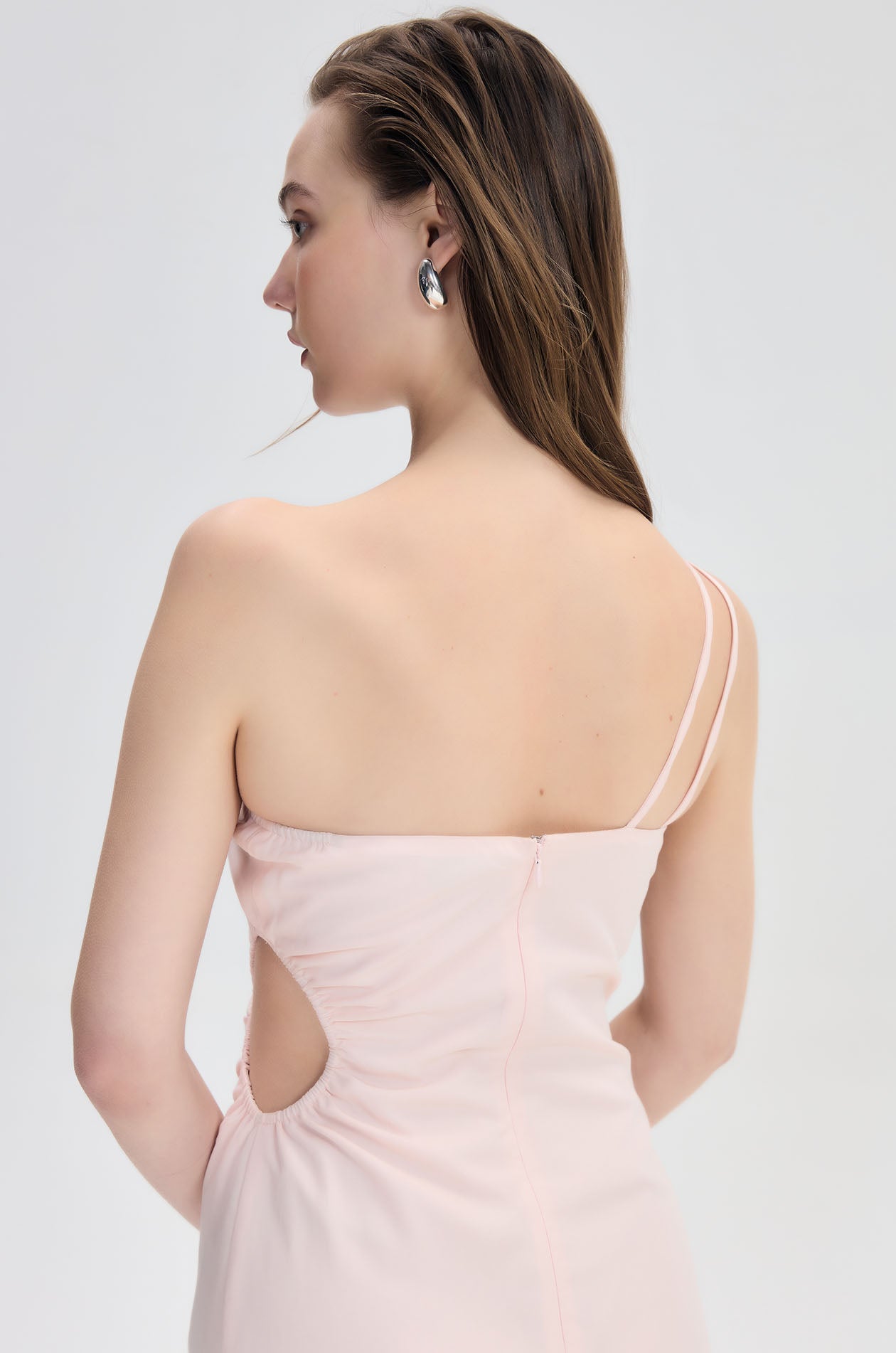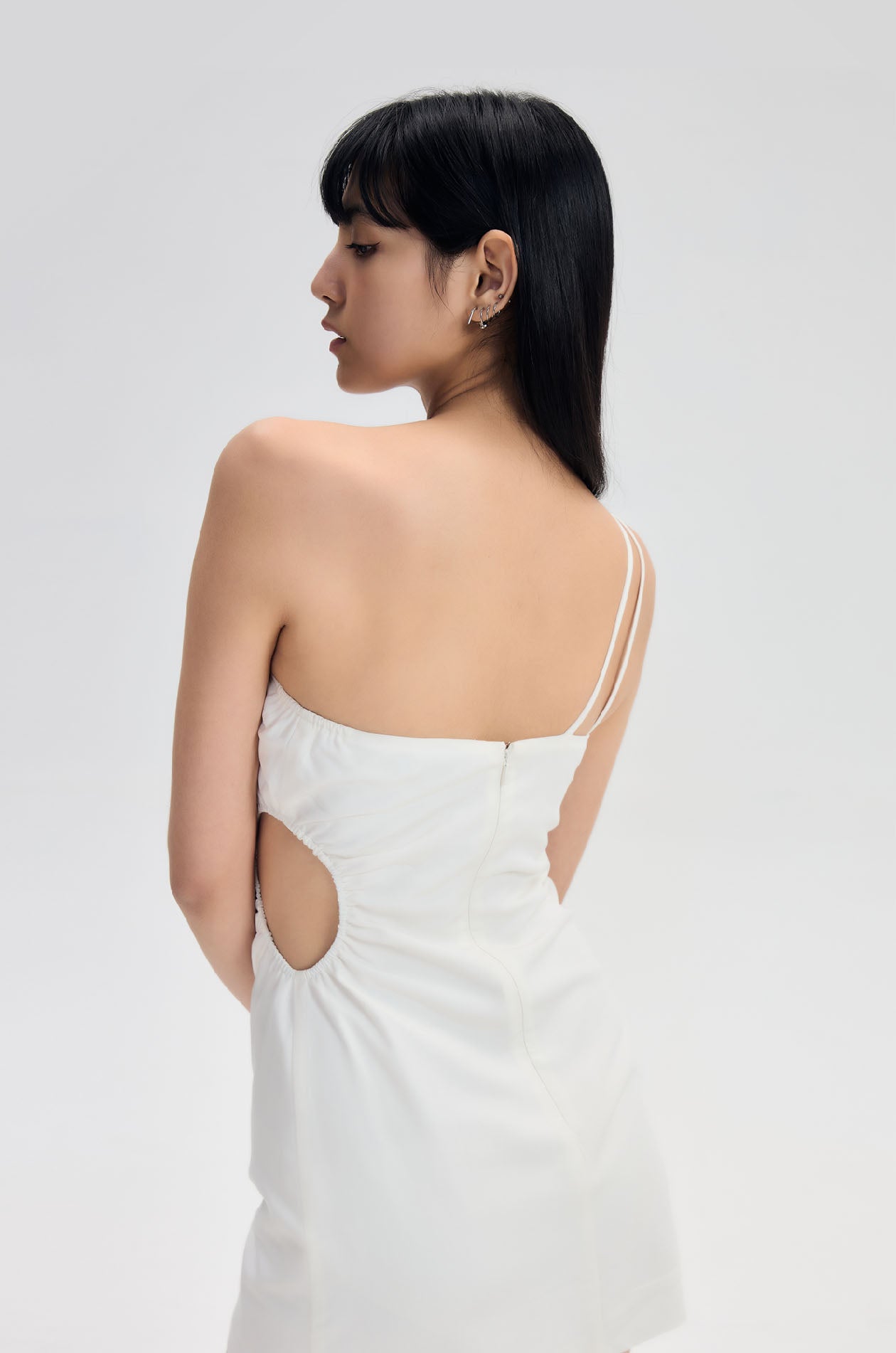 One-shoulder mini dress in textured fabric, crafted from sustainable lyocell and linen blend. Sheath silhouette with side slit and cut-out detail at the left waist. Back zip closure. Available in egret and peach blush.
