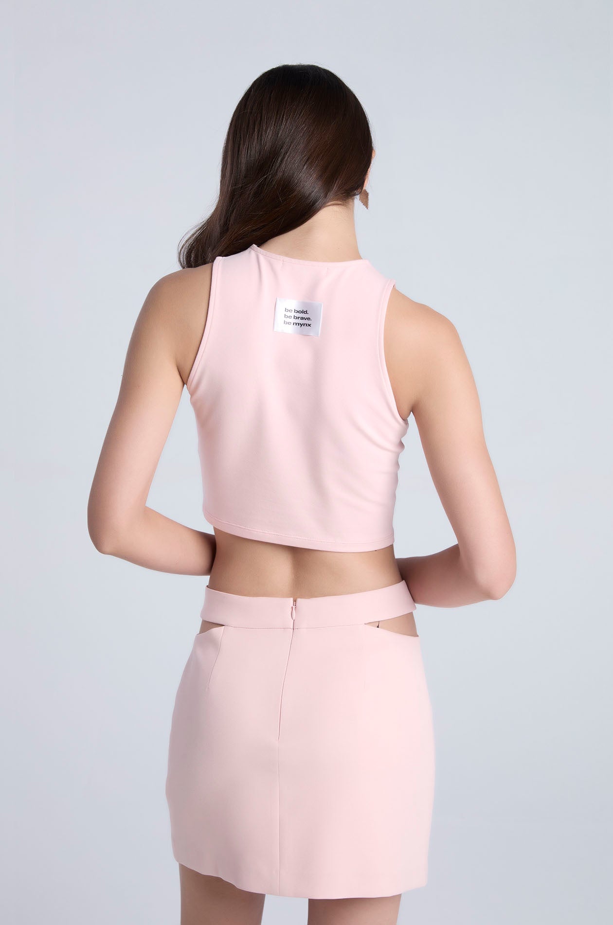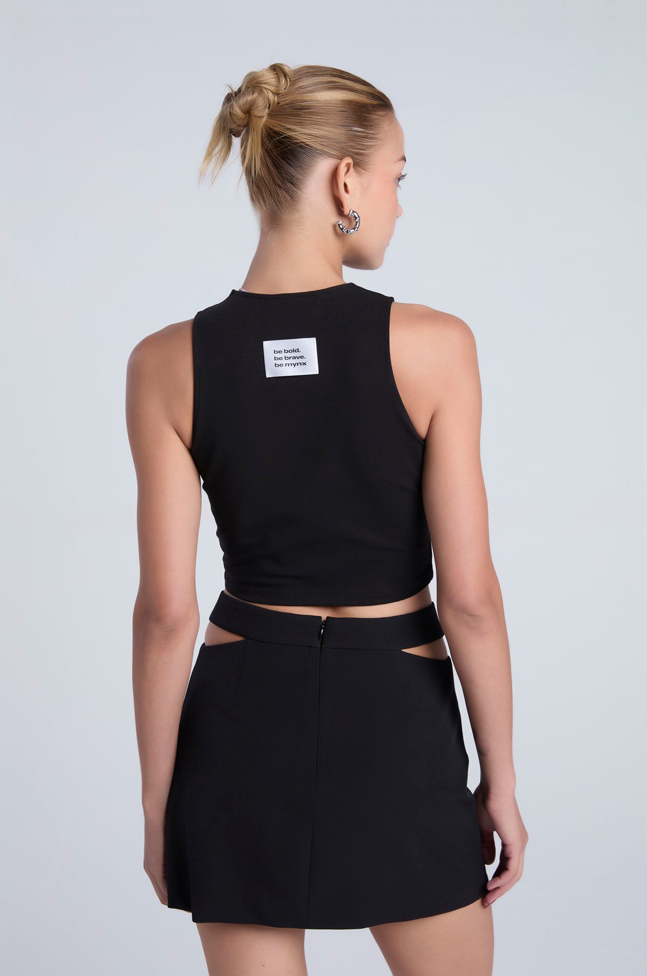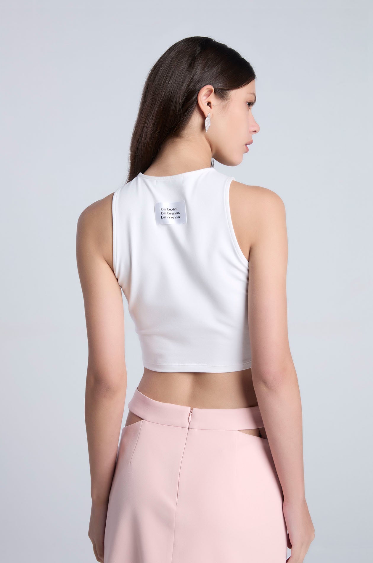 Sleeveless crop top in stretchy jersey. Features a fitted silhouette with a crew neckline, seamed detailing, and a badge with quote detail at the back neckline. Available in black, white, and Rosebloom.