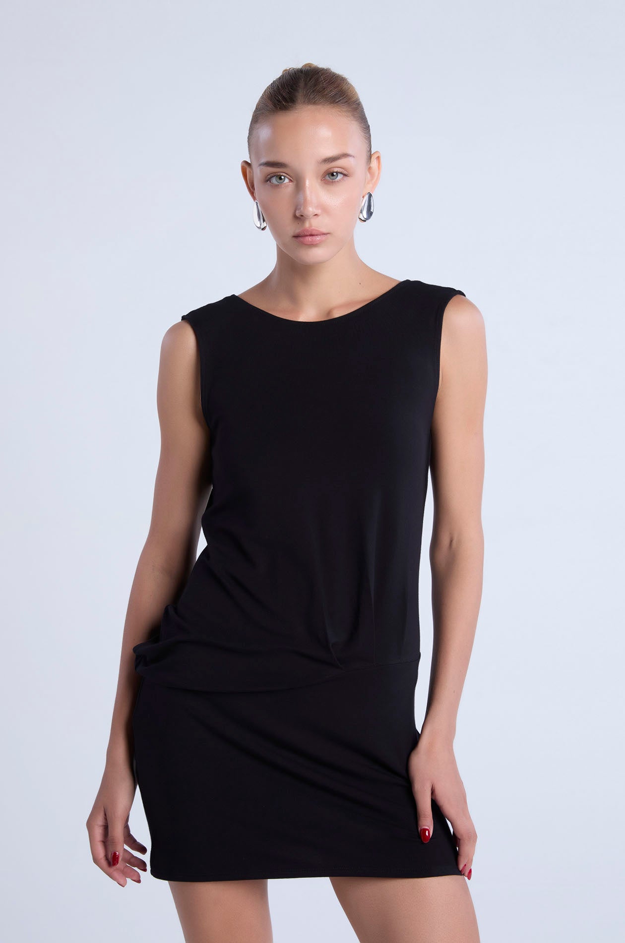 Sleeveless mini dress in stretchy jersey with lace trim. Features a boat neckline, draped detail at the waistline, and draped open-back with overlapping panels. Available in black.