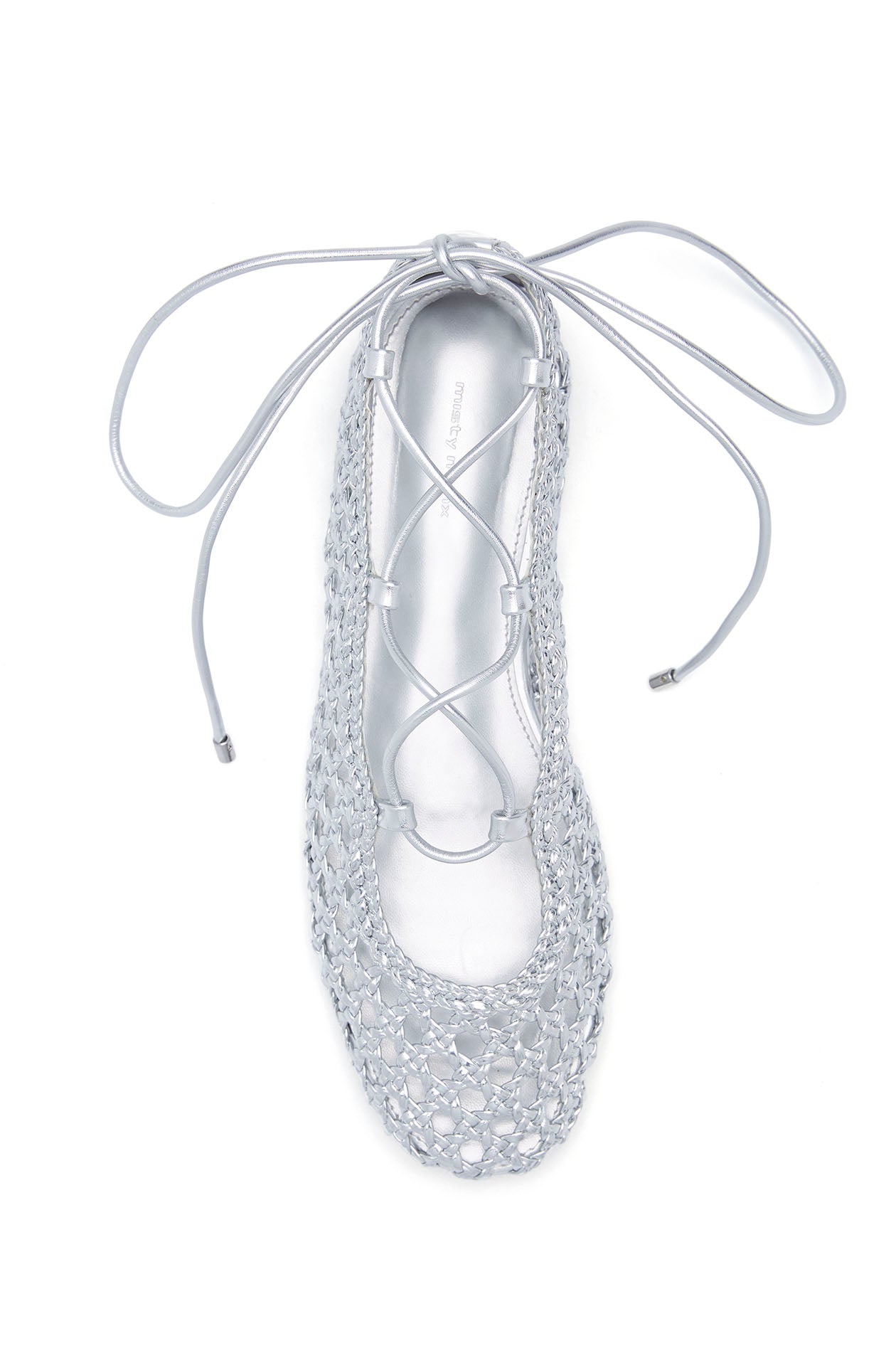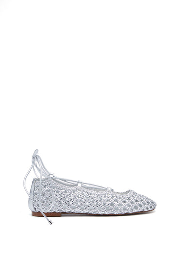Flat ballerinas crafted from openwork crochet-style faux leather, featuring a delicate side shoelace detail. Available in silver.