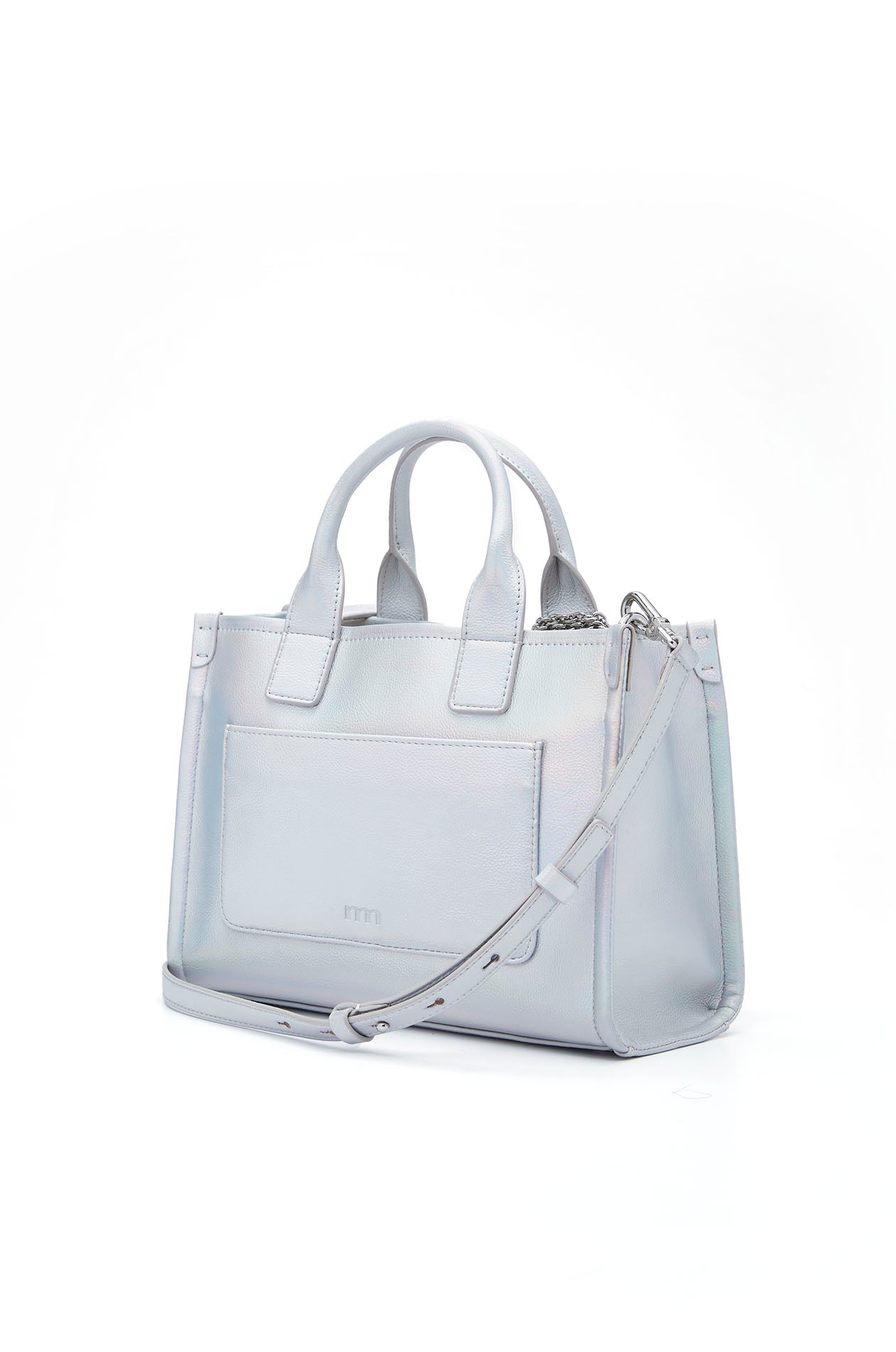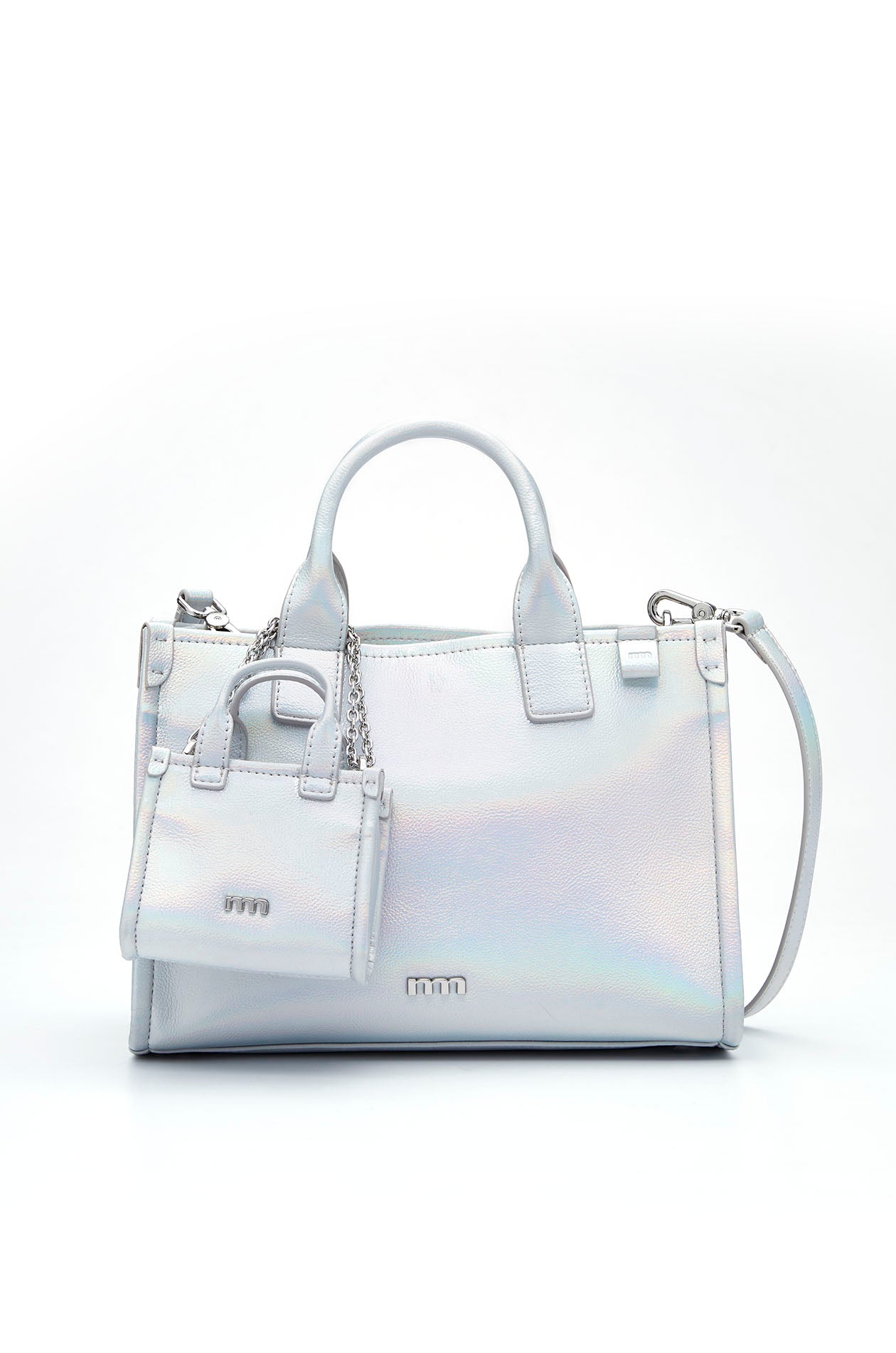 Square-shaped handbag crafted from faux leather with a pearlescent finish. Features structured top handles and a detachable shoulder strap. Includes a matching mini pouch. Available in silver.
