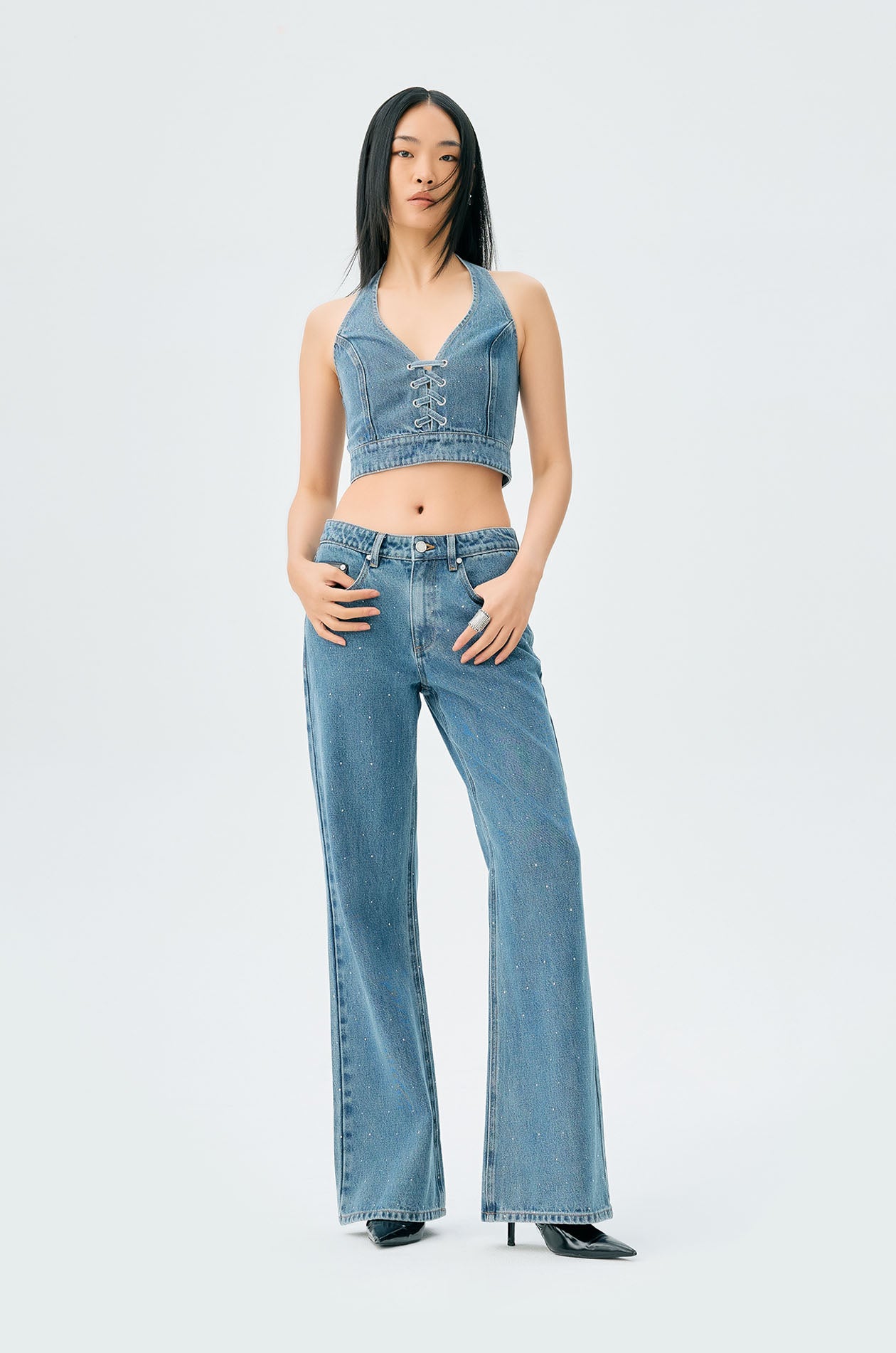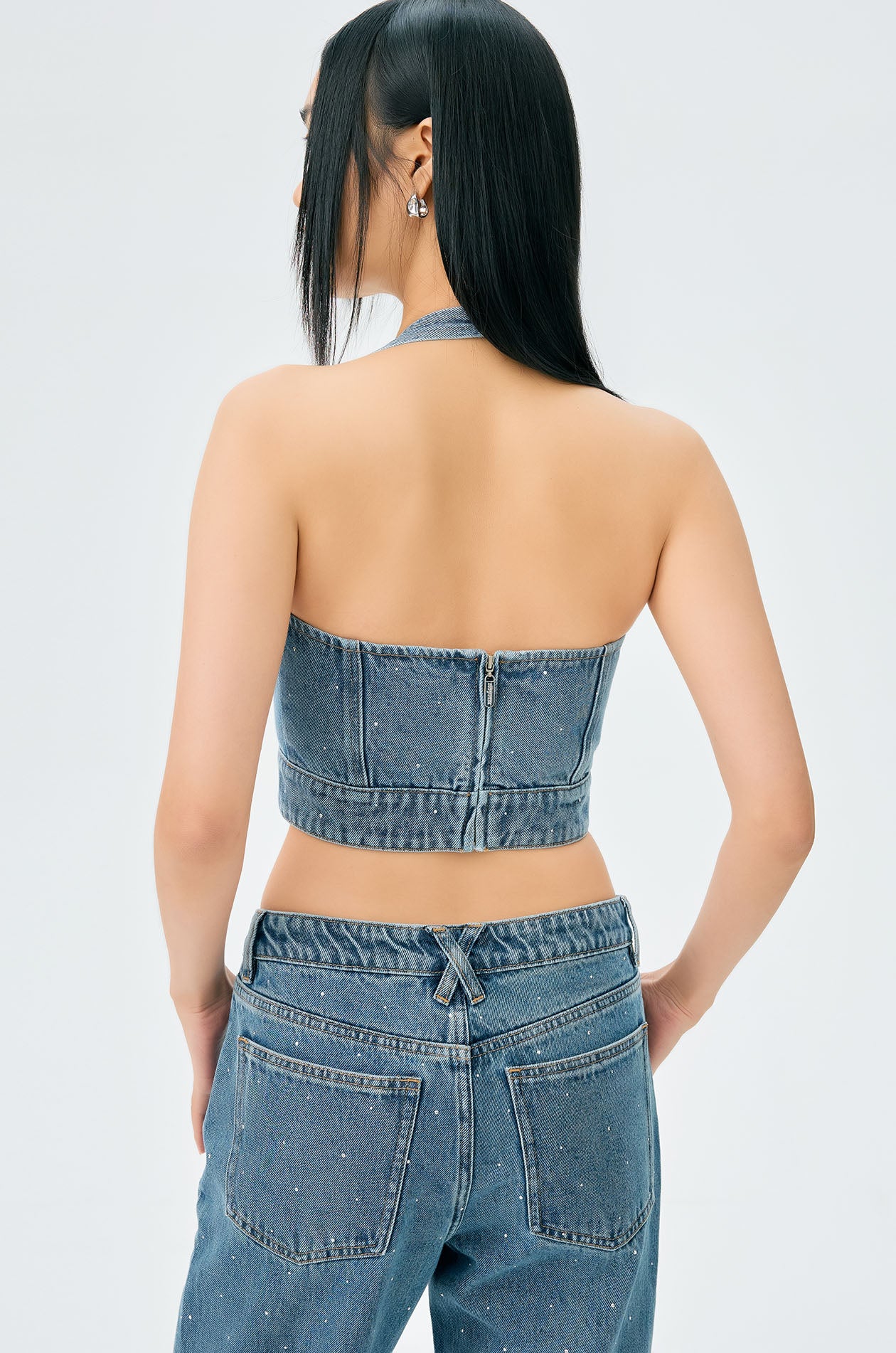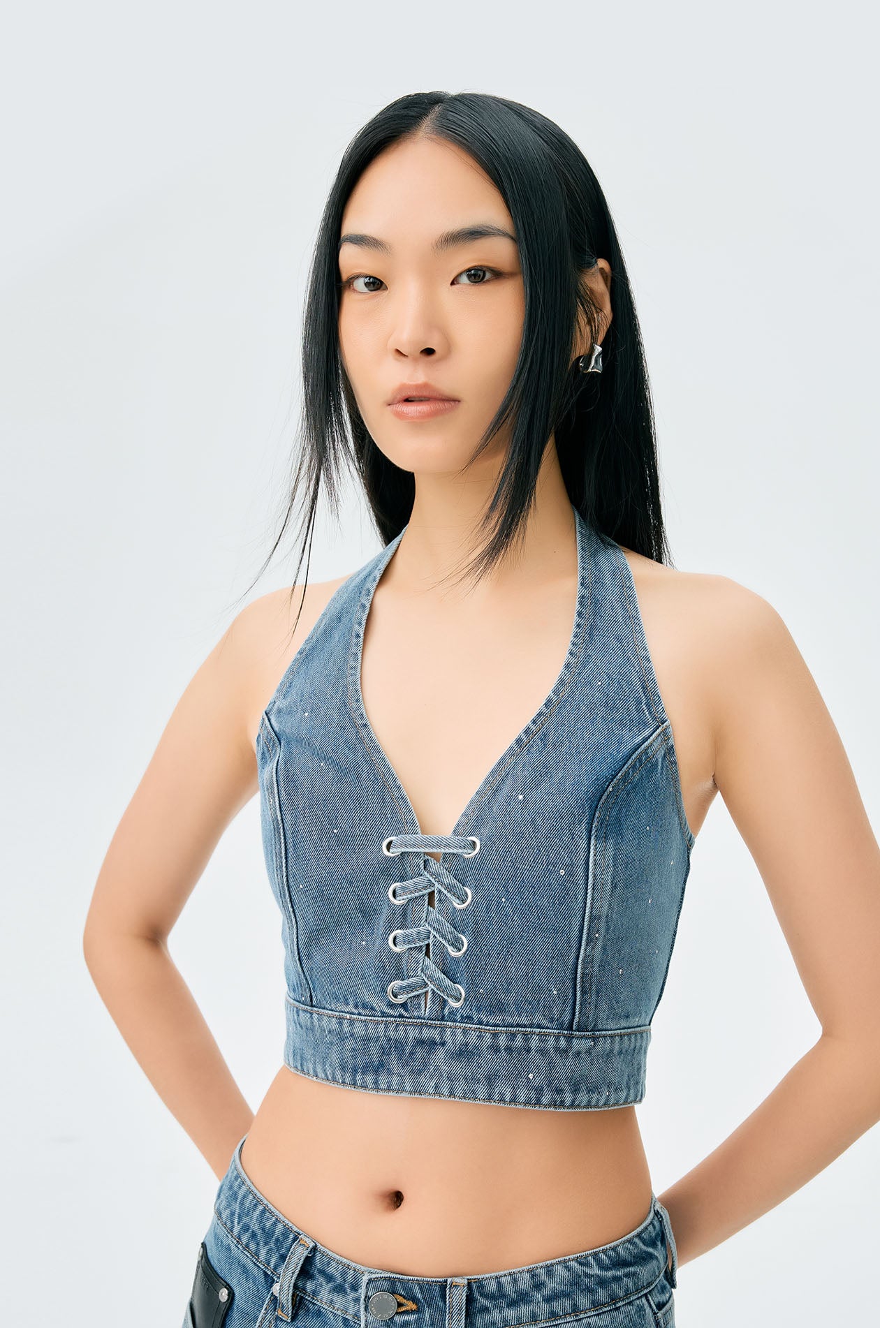 Halter neck crop top in cotton denim. Front lacing detail and rhinestone embellishment. Back zip closure. Available in blue.