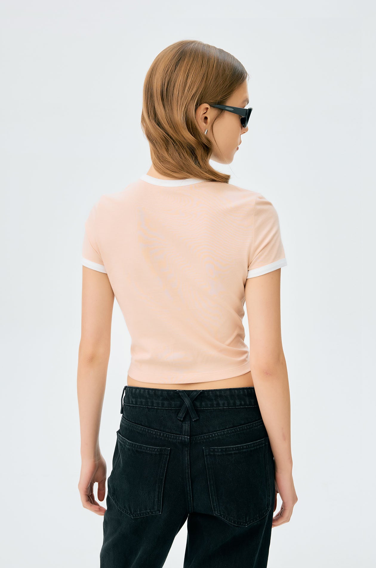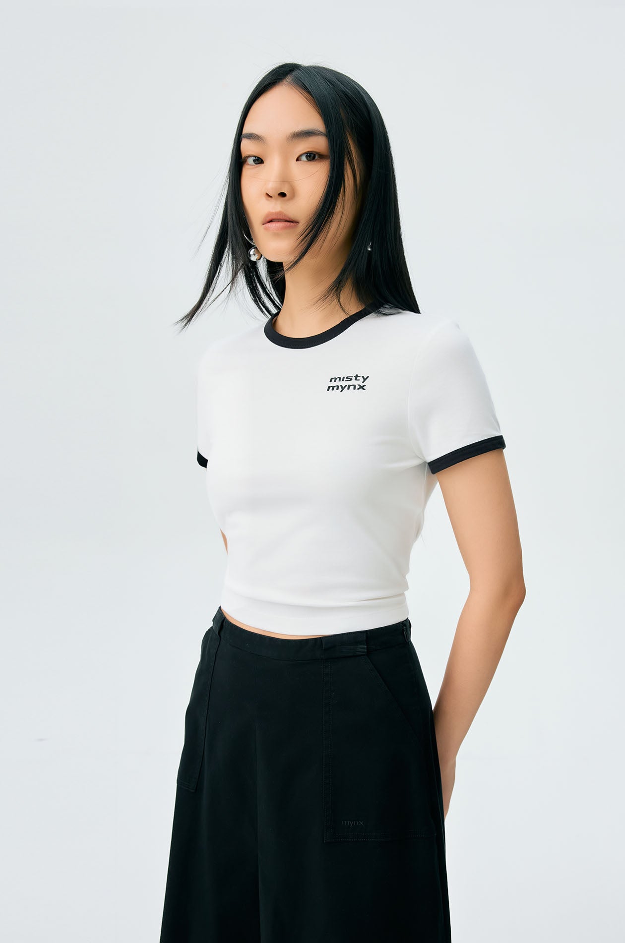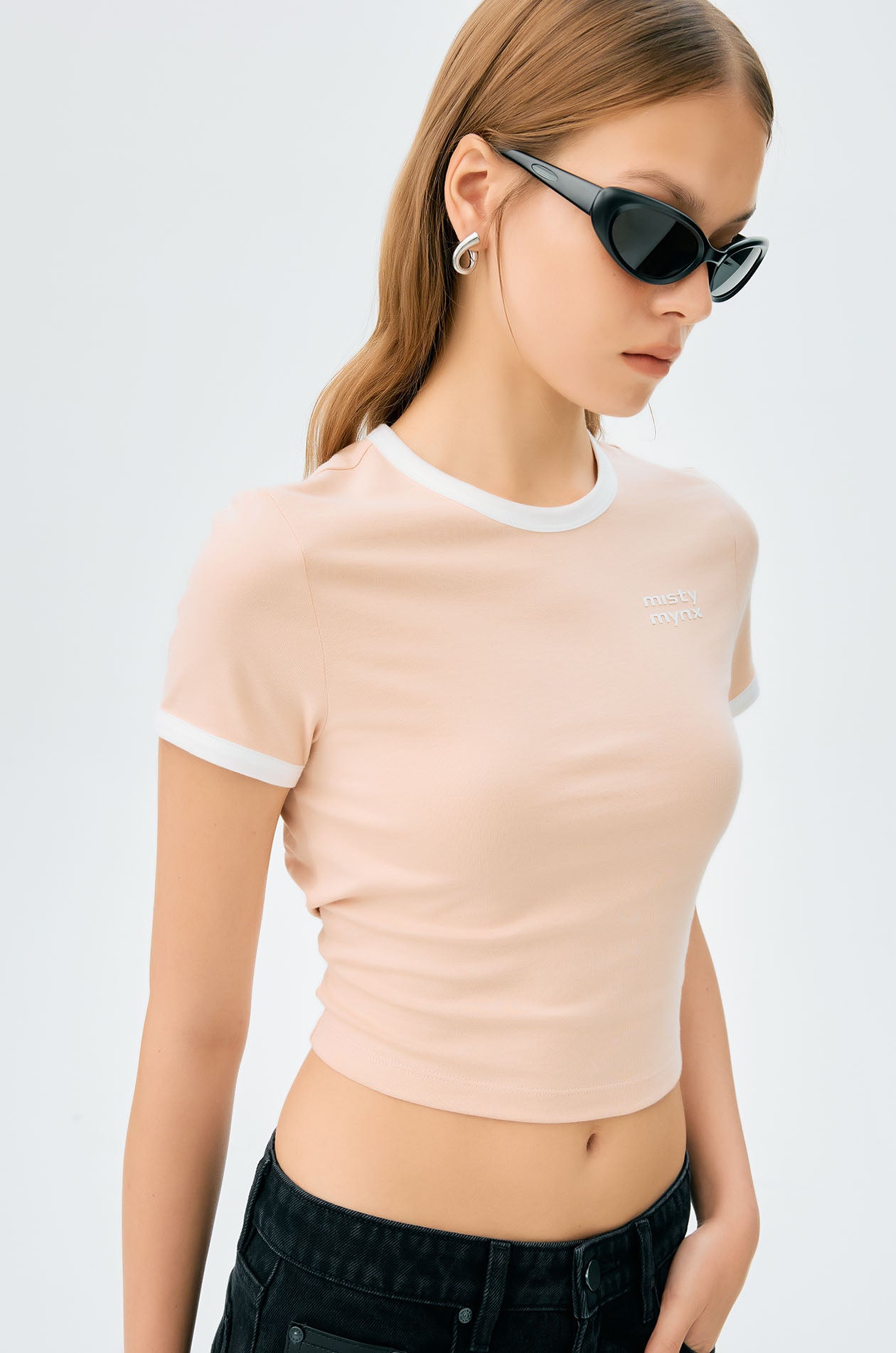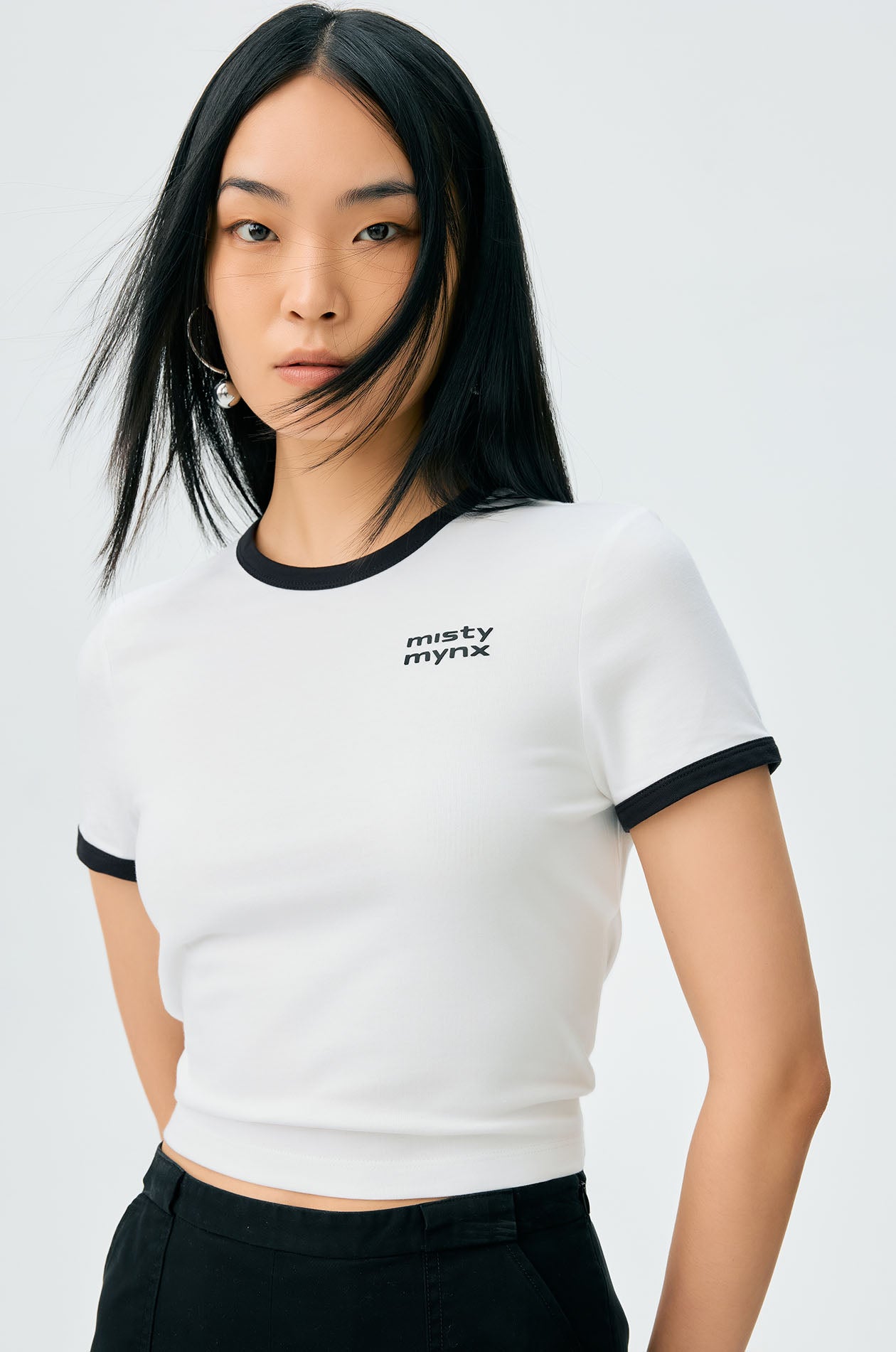 Short-sleeved ringer baby tee in cotton jersey. Slim fit with minimal lettering logo at the chest. Available in spanish vanilla, black, and white.