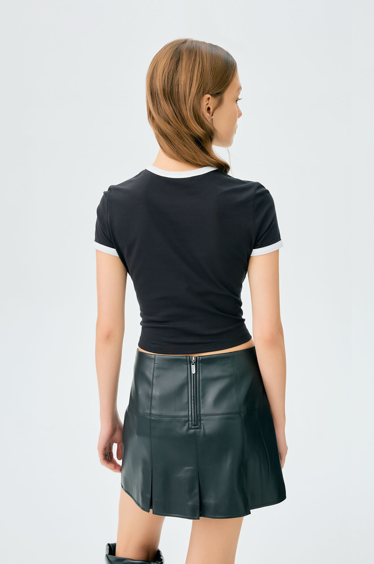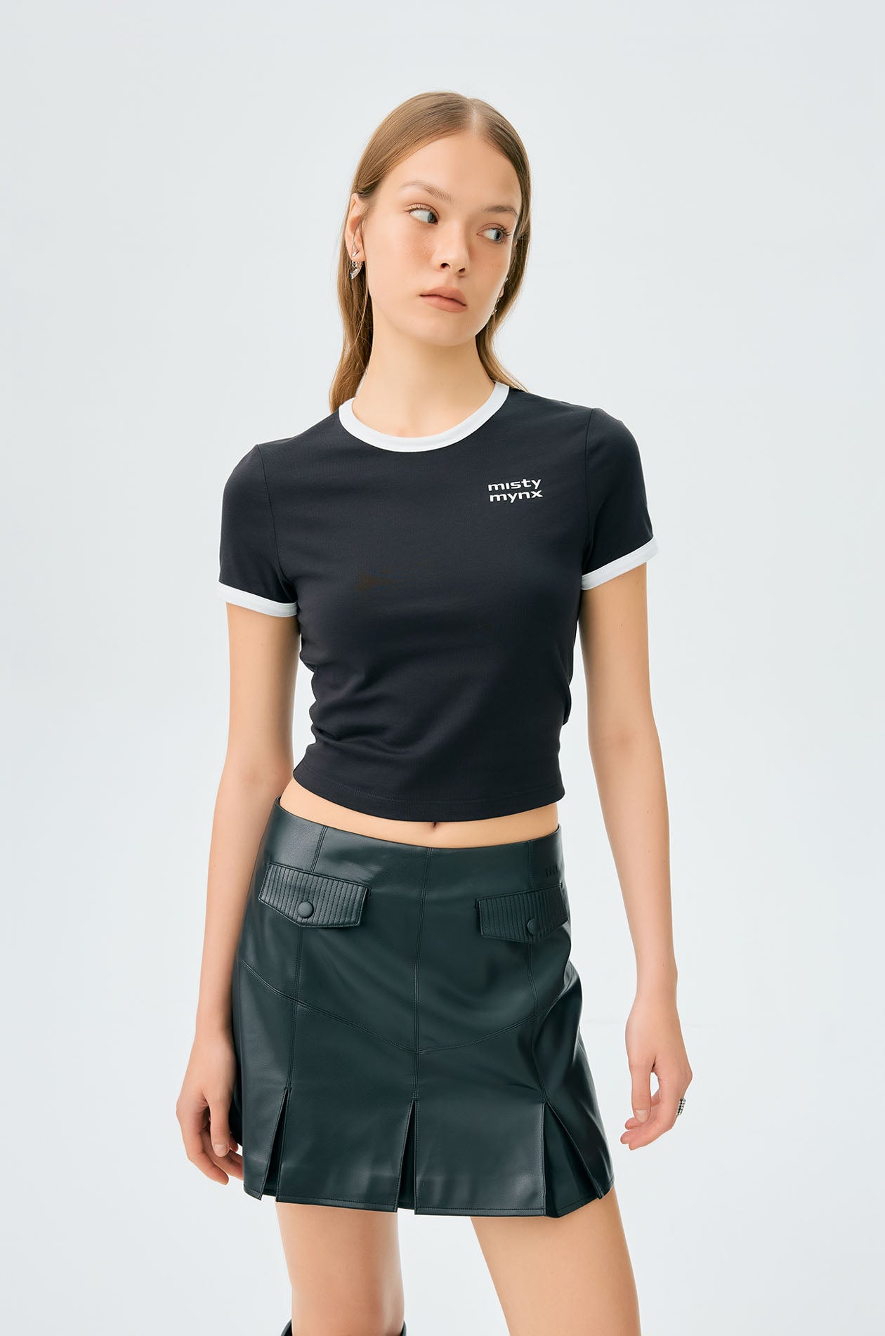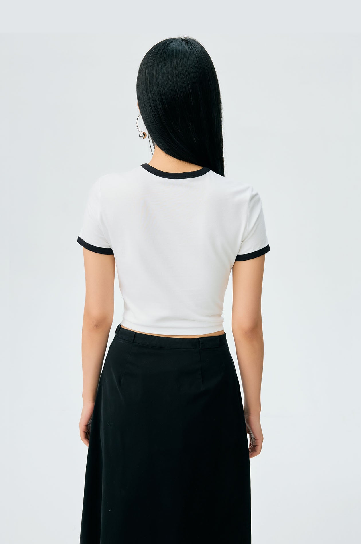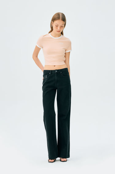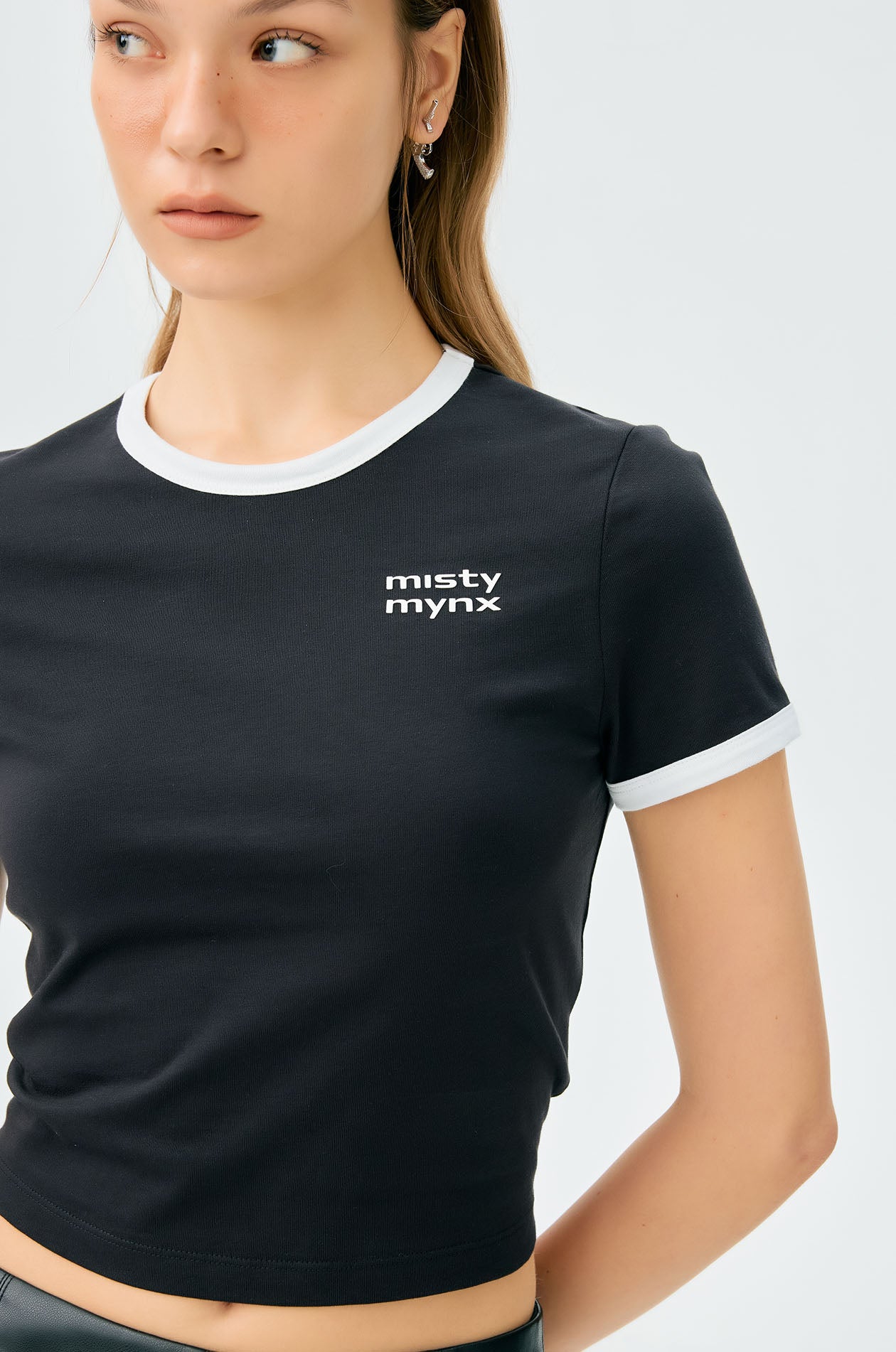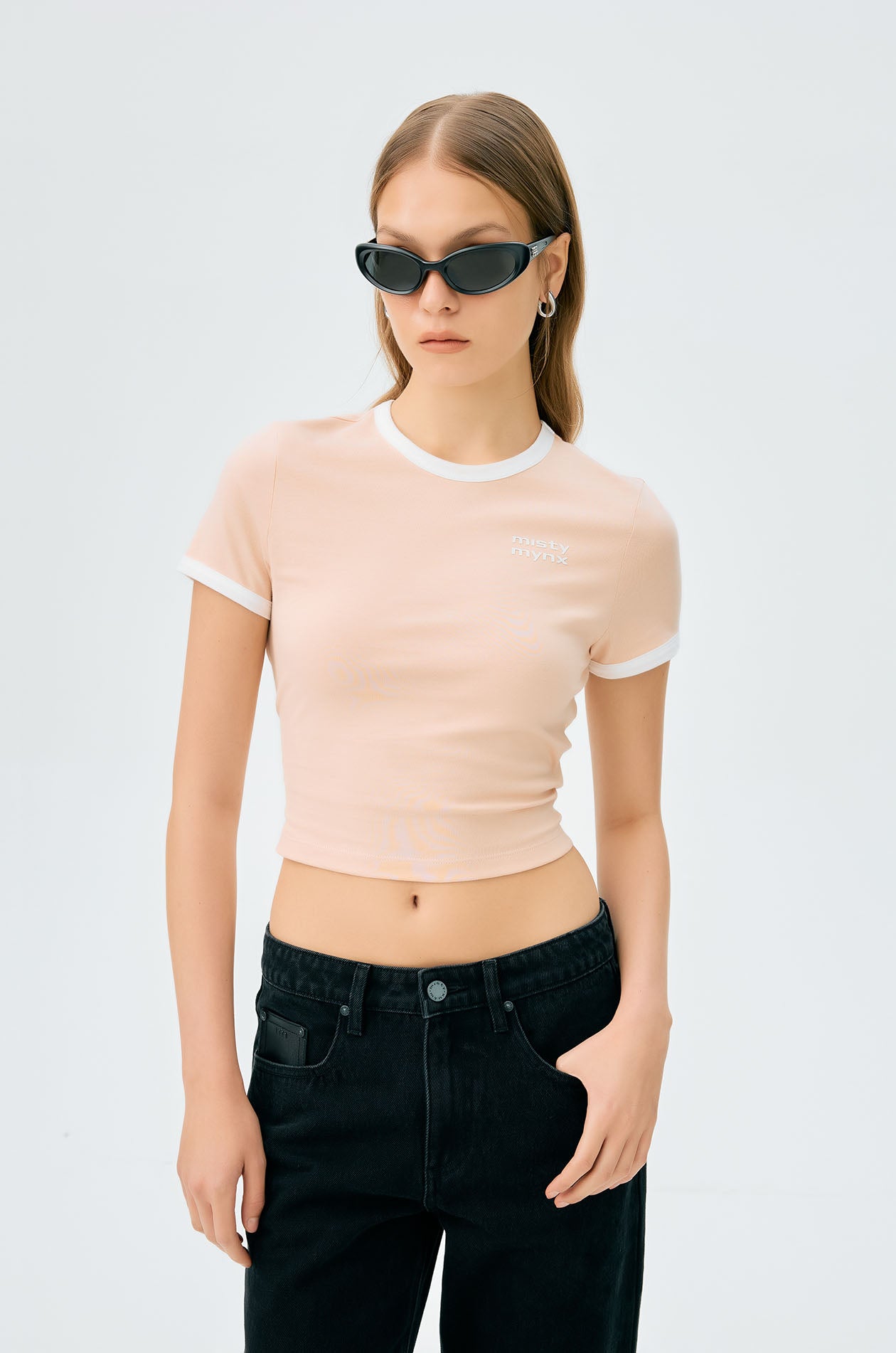 Short-sleeved ringer baby tee in cotton jersey. Slim fit with minimal lettering logo at the chest. Available in spanish vanilla, black, and white.
