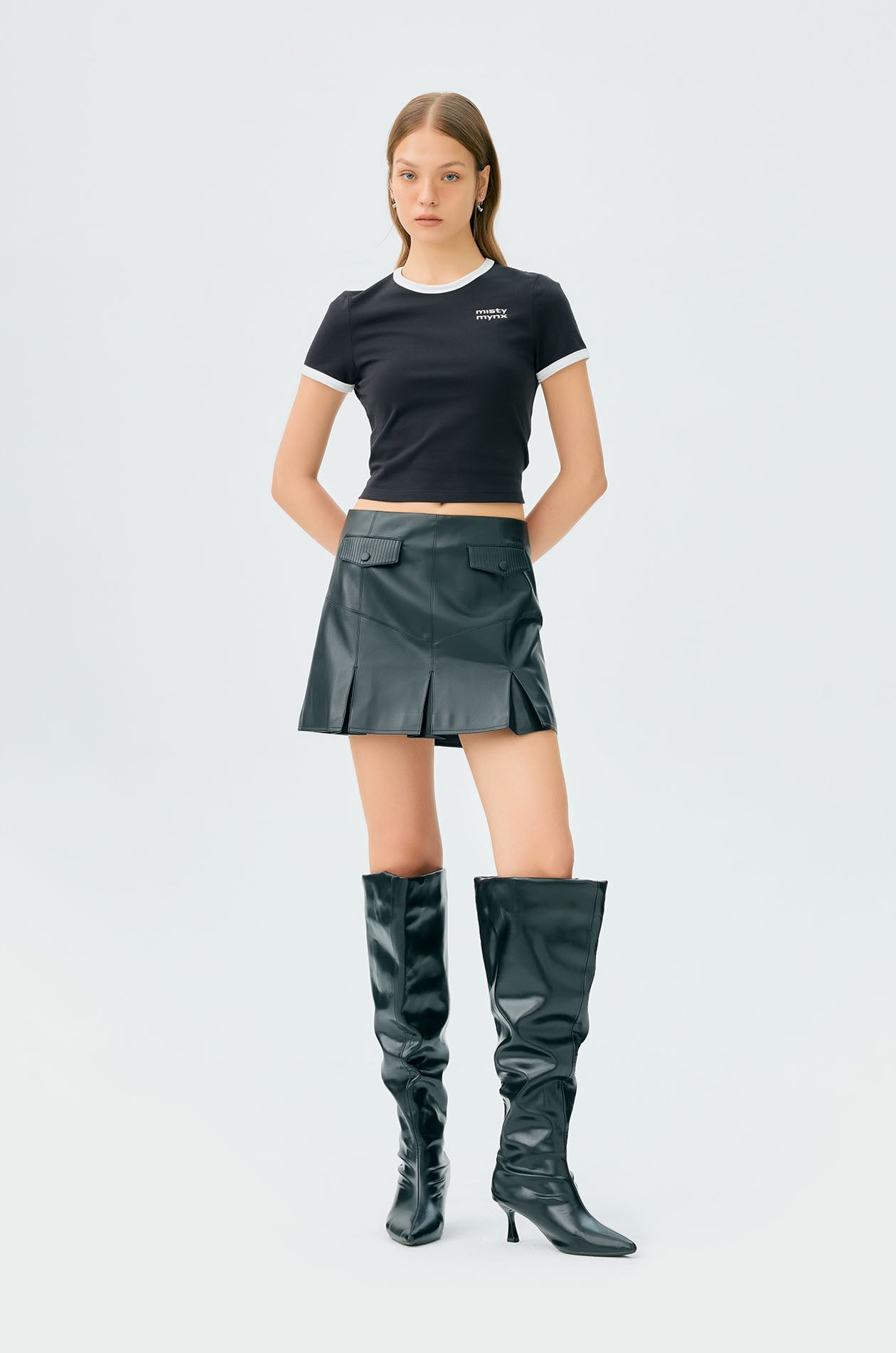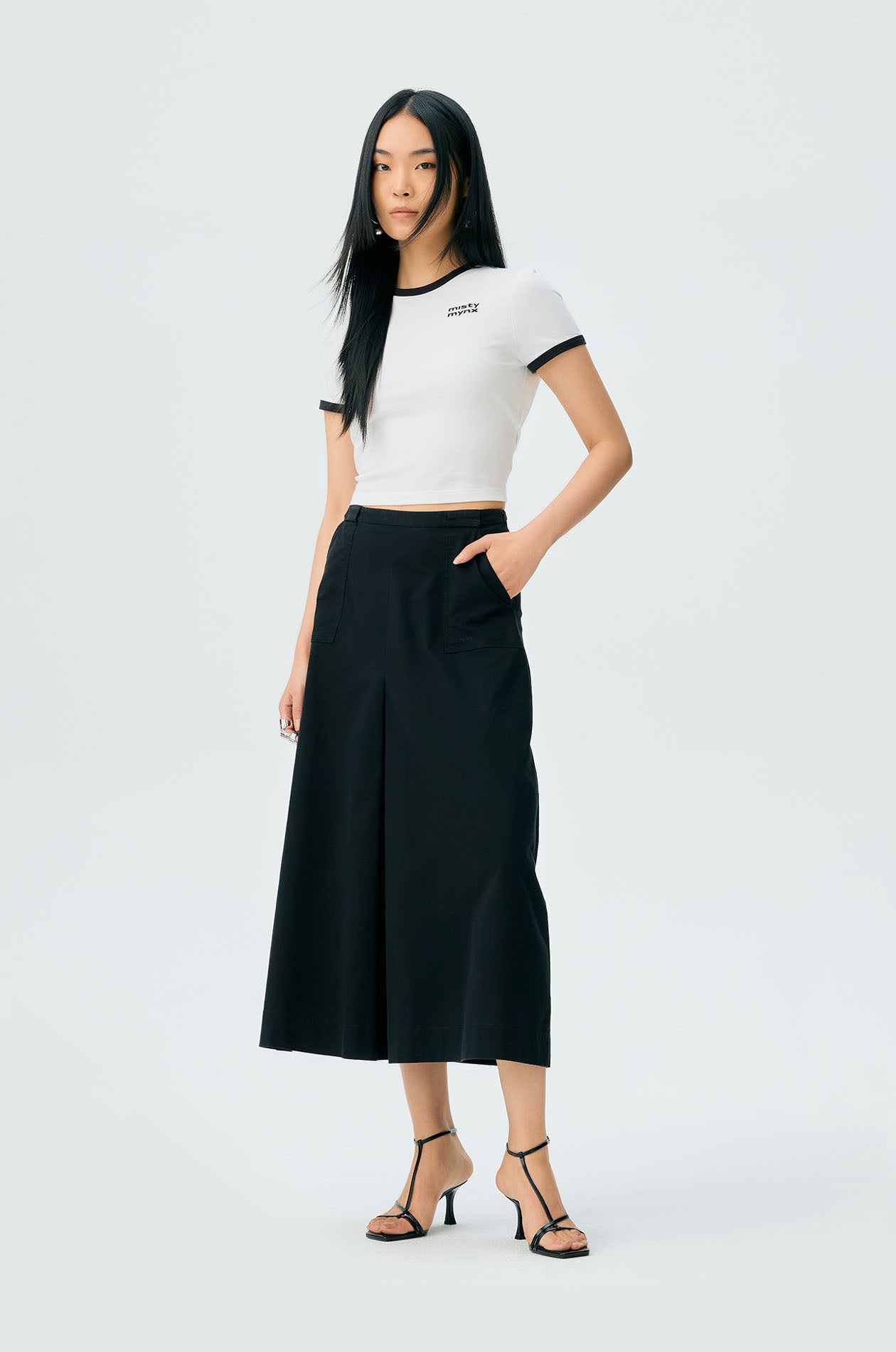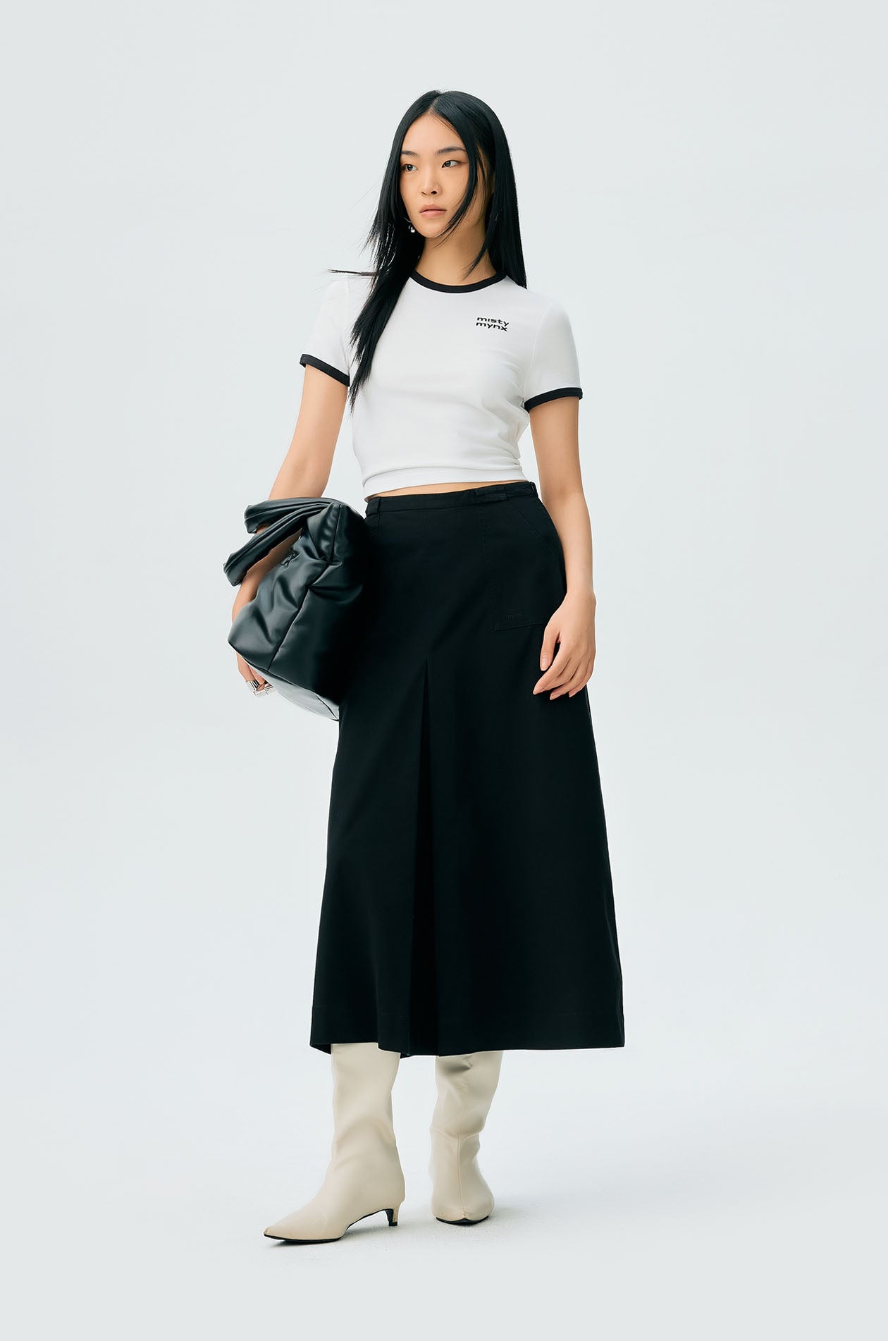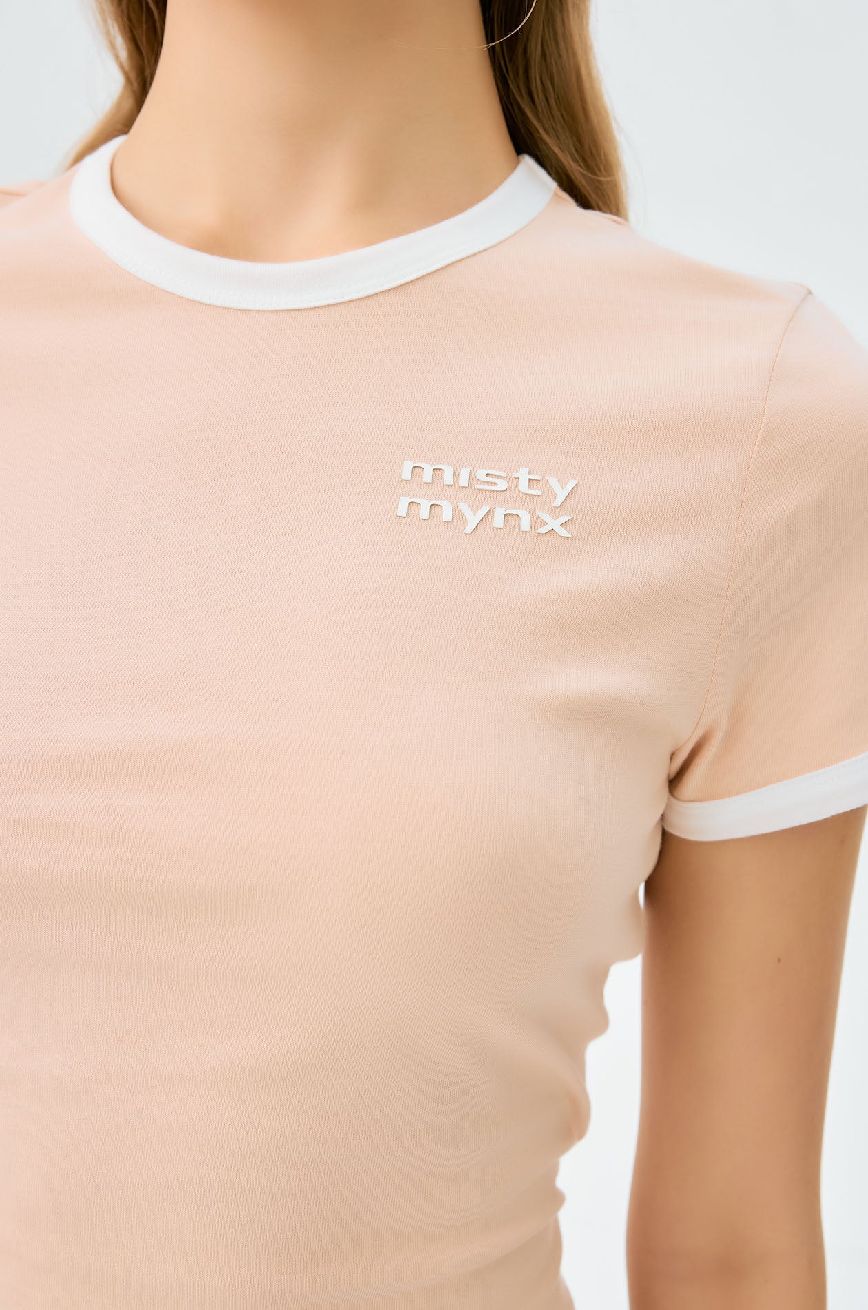 Short-sleeved ringer baby tee in cotton jersey. Slim fit with minimal lettering logo at the chest. Available in spanish vanilla, black, and white.