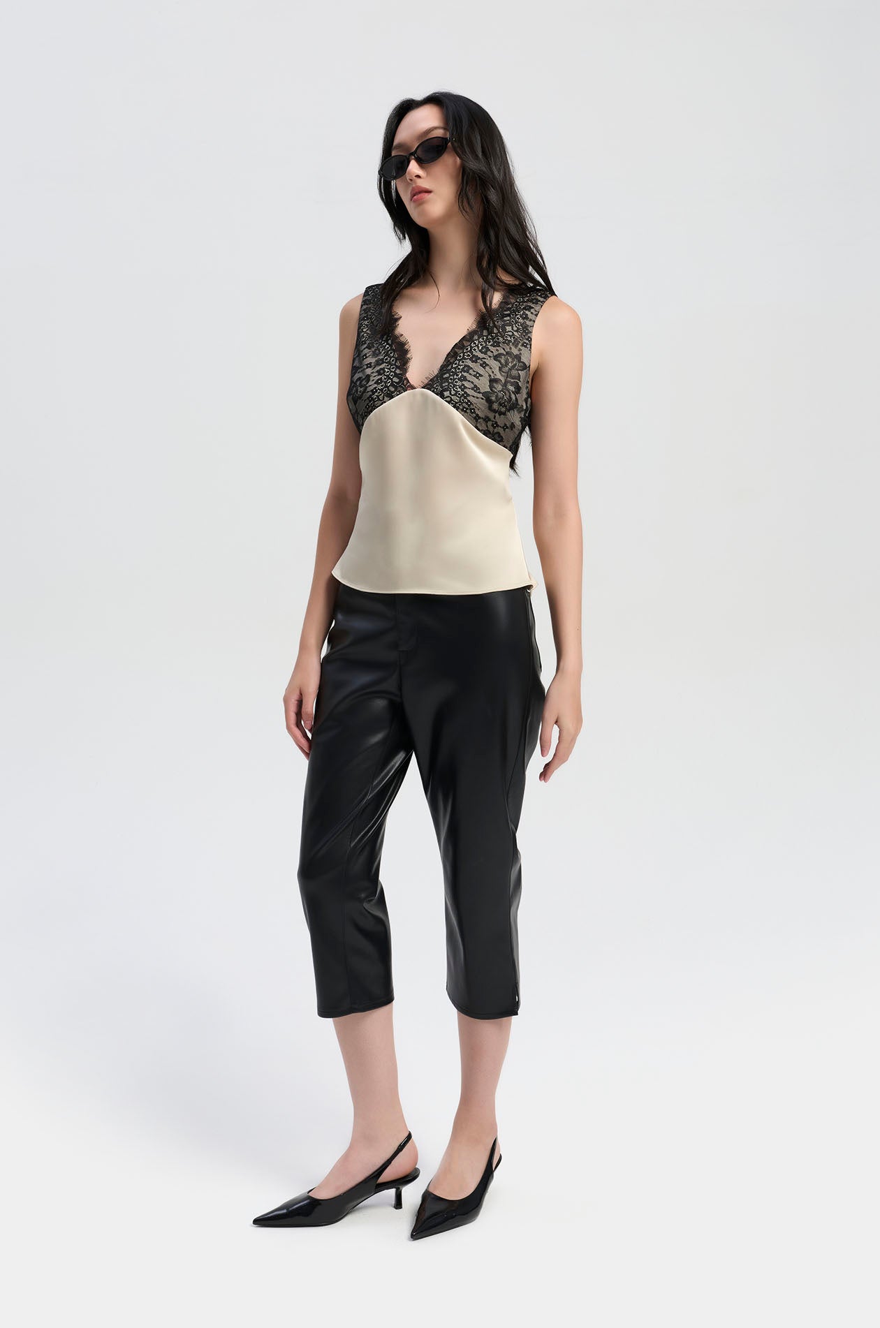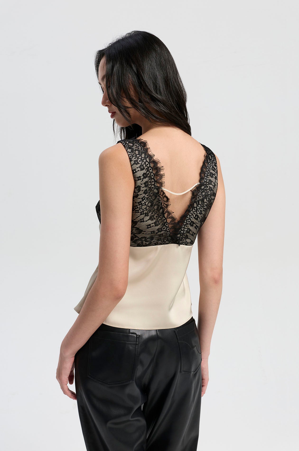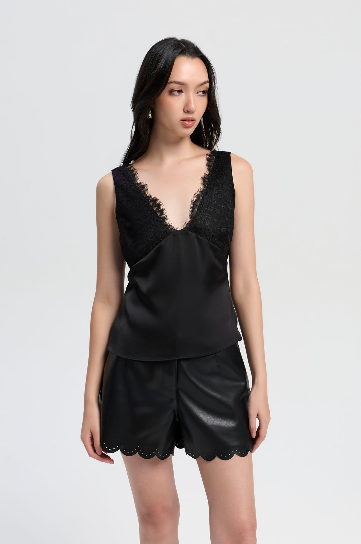 Sleeveless top crafted from smooth satin, contrasted with delicate lace panels that frame the upper body. Designed with a plunging neckline, it features scalloped lace edges that add a soft, feminine finish. The slim fit enhances the shape, while the combination of textures creates a refined, modern look. Available in black and beige.
