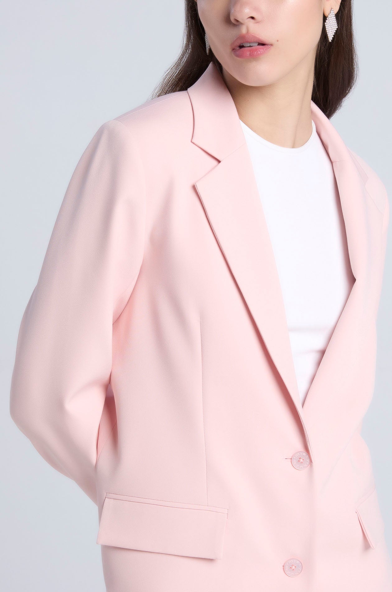 Single-breasted longline blazer in woven fabric. Regular fit with notch lapel, padded shoulders, and front pockets. Front button closure. Available in black and Rosebloom.