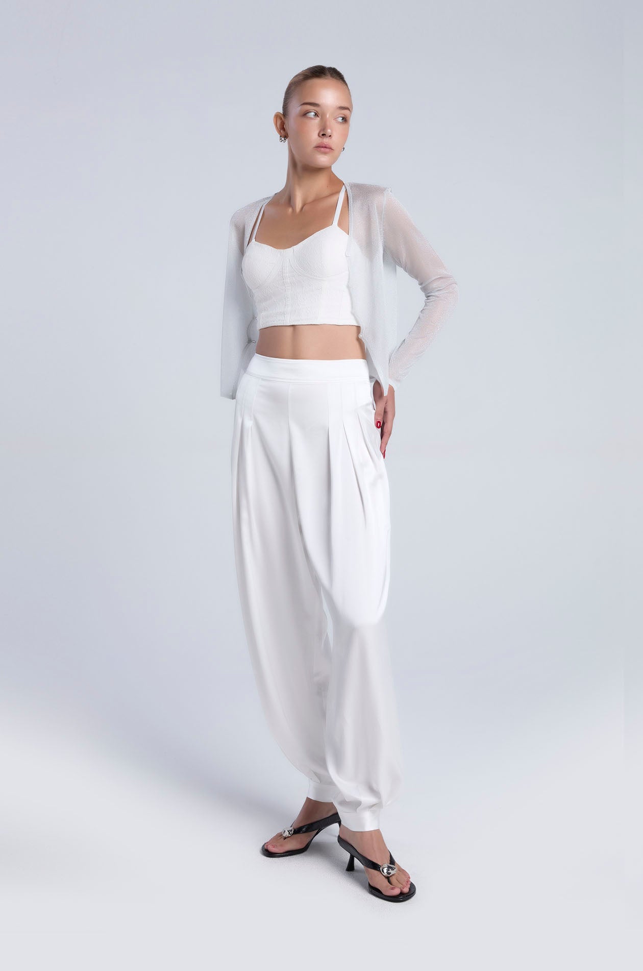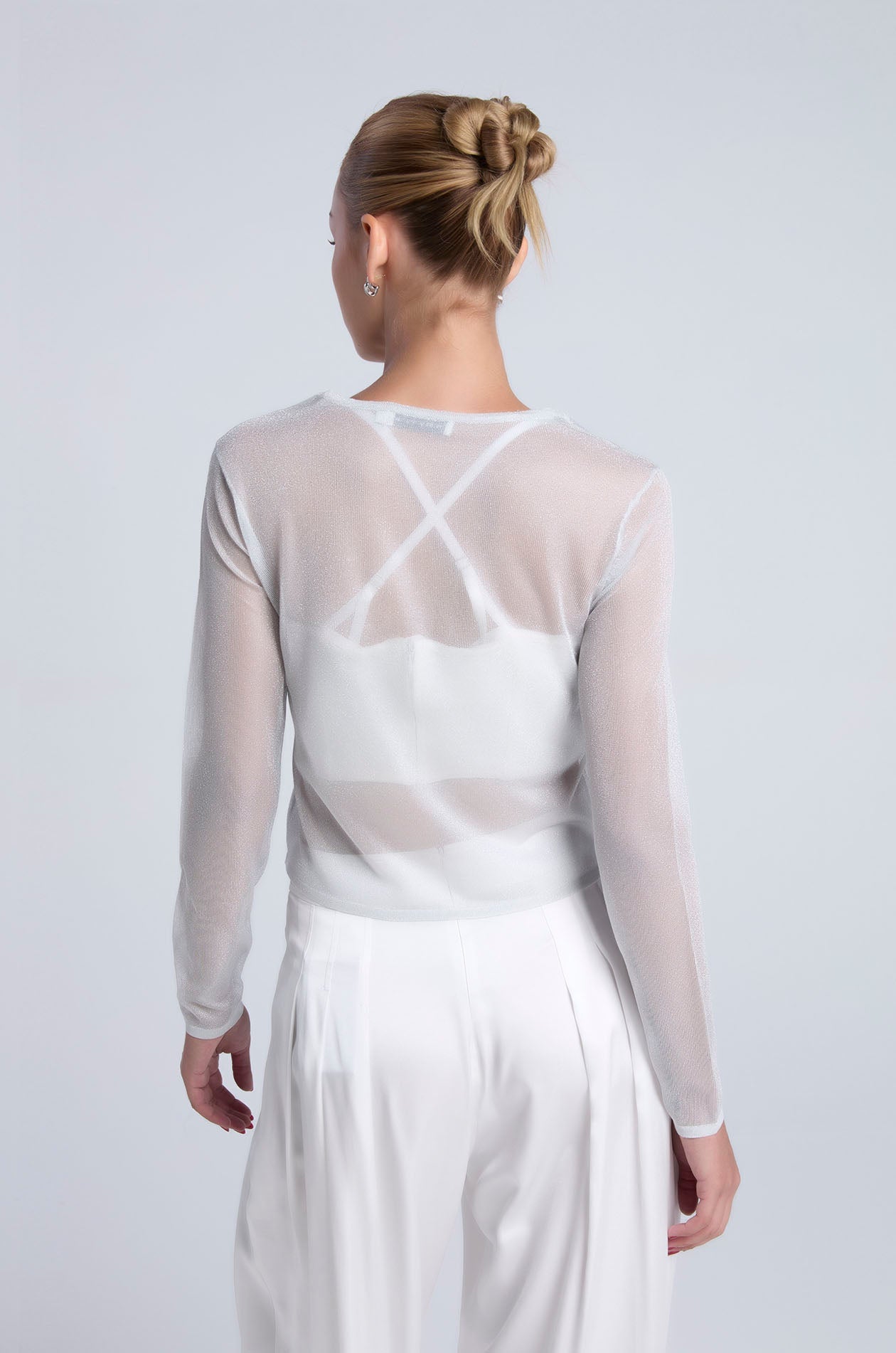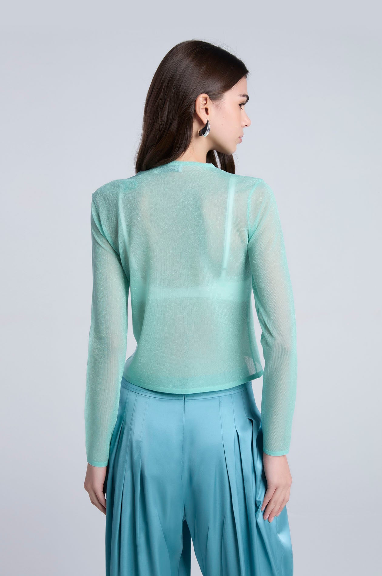 Long-sleeved cardigan in metallic knit. Fitted silhouette with V neckline. Available in Ice Green and white.