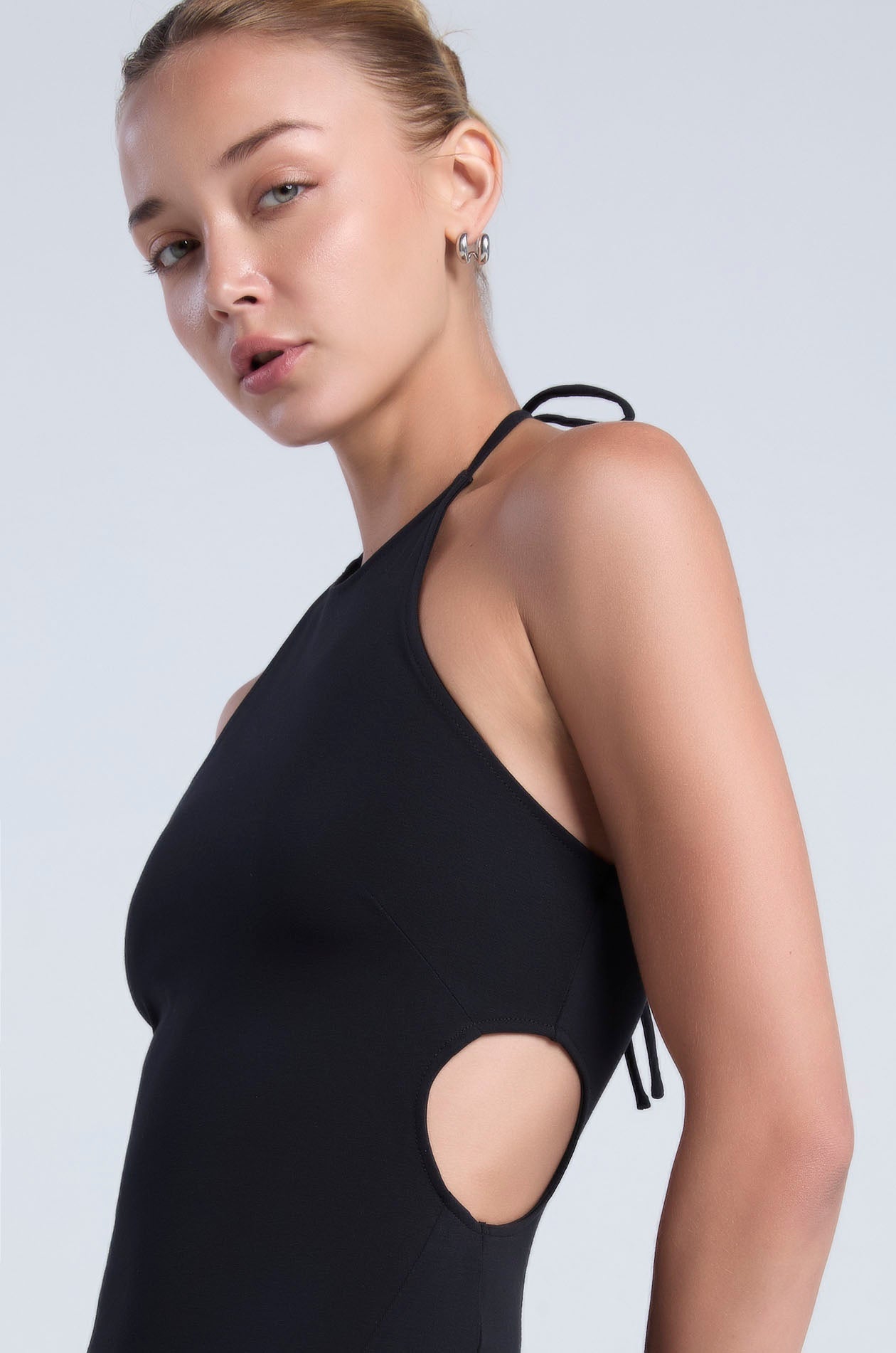 Halter neck mini dress in stretchy jersey. Sheath silhouette with backless design and halter neck tie. Available in black.
