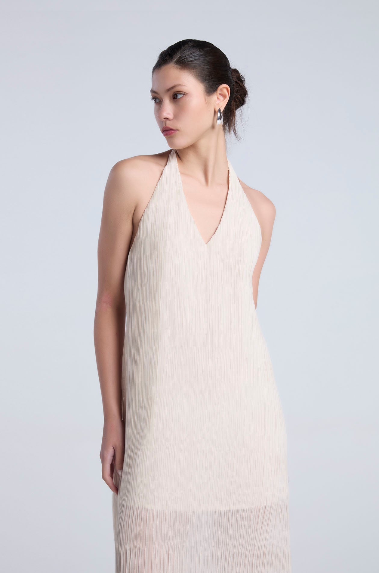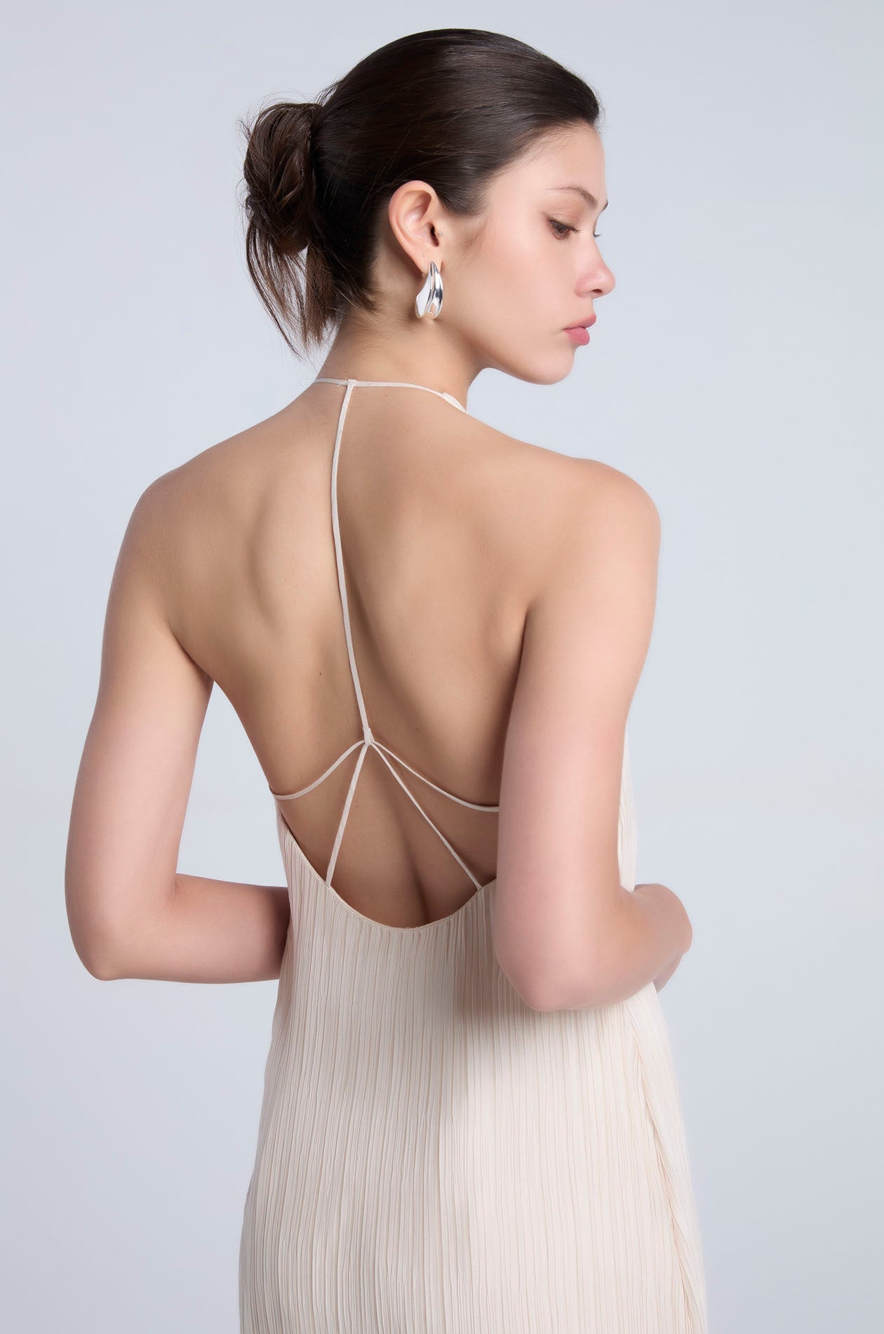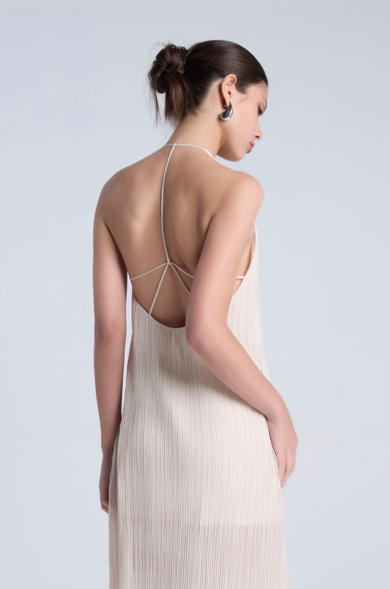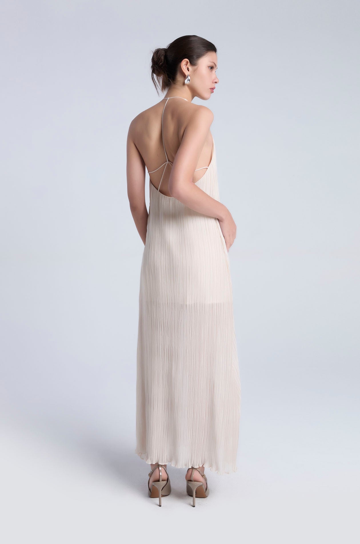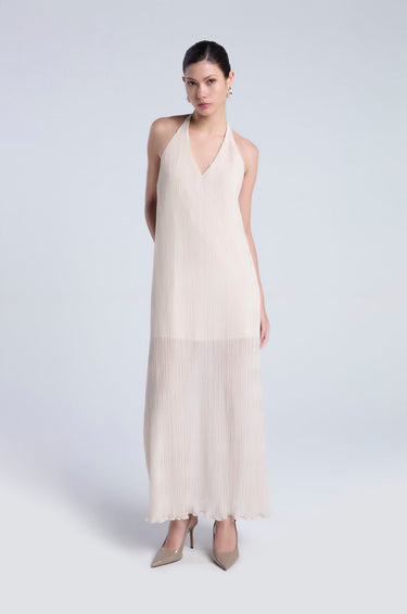 Halter-neck maxi dress in plissรฉ chiffon. Features a backless design, sheer effect with partial lining, and lettuce-edge hem. Side zip closure. Available in light taupe.