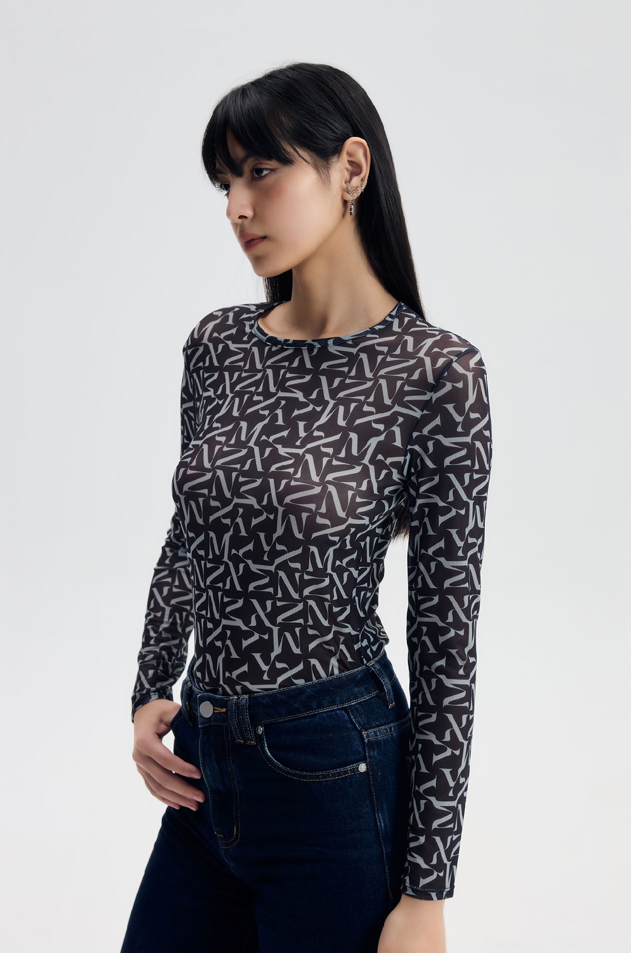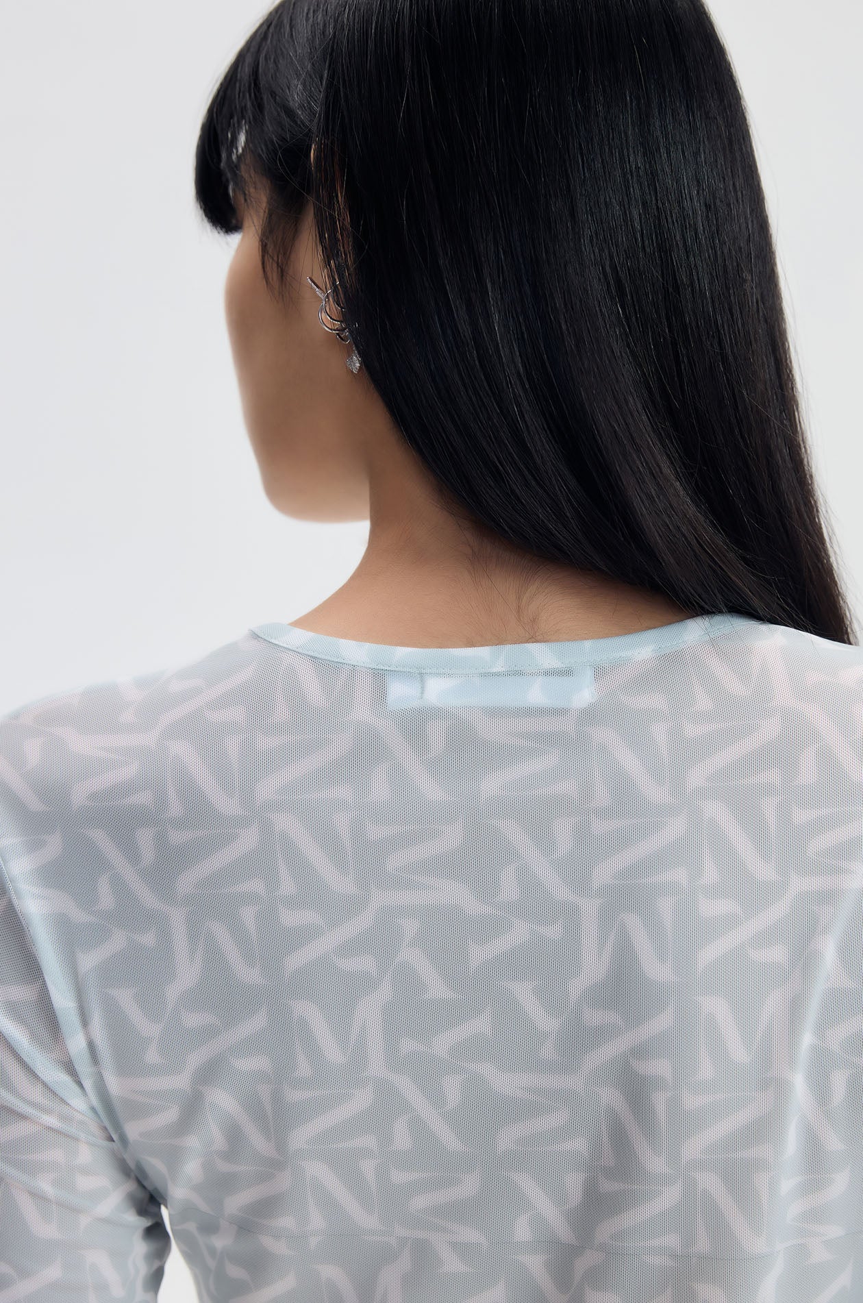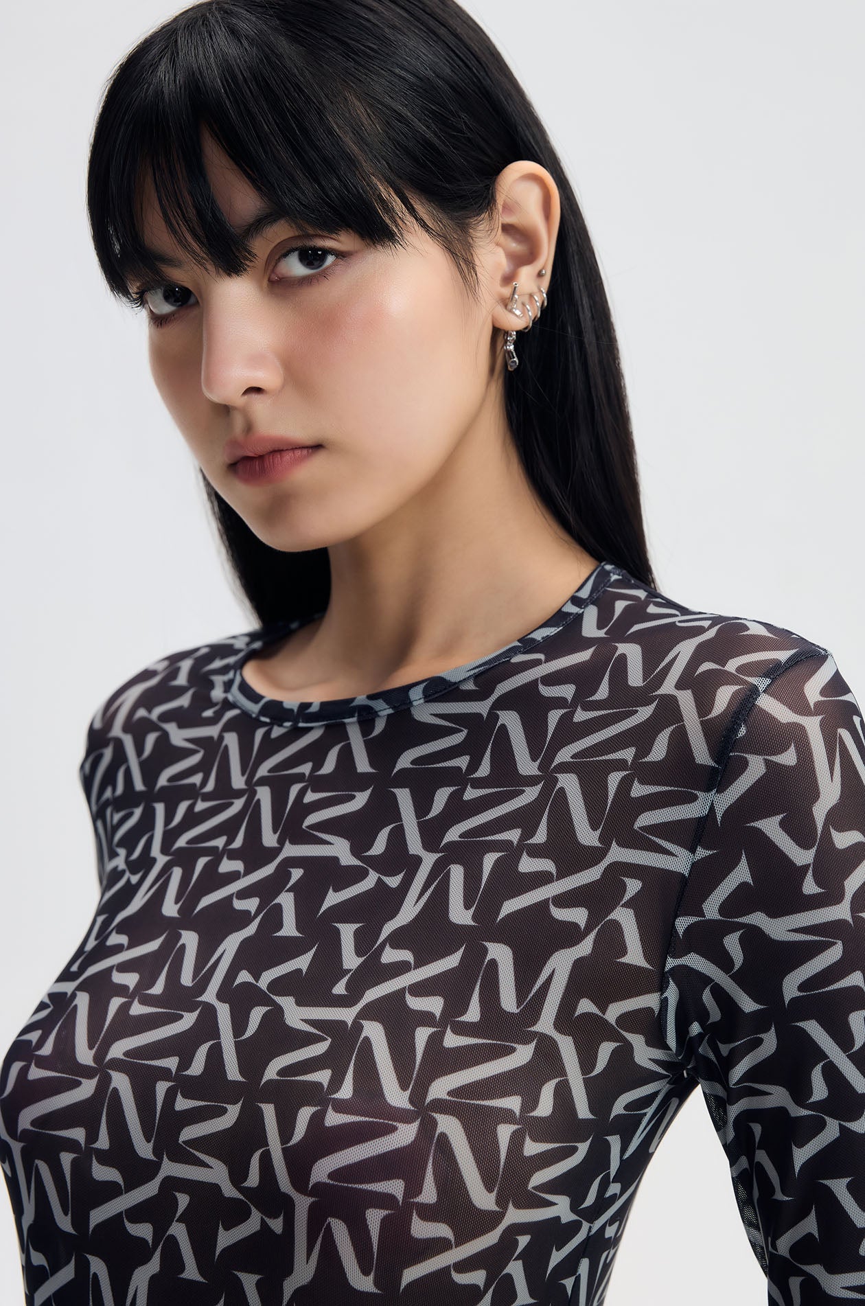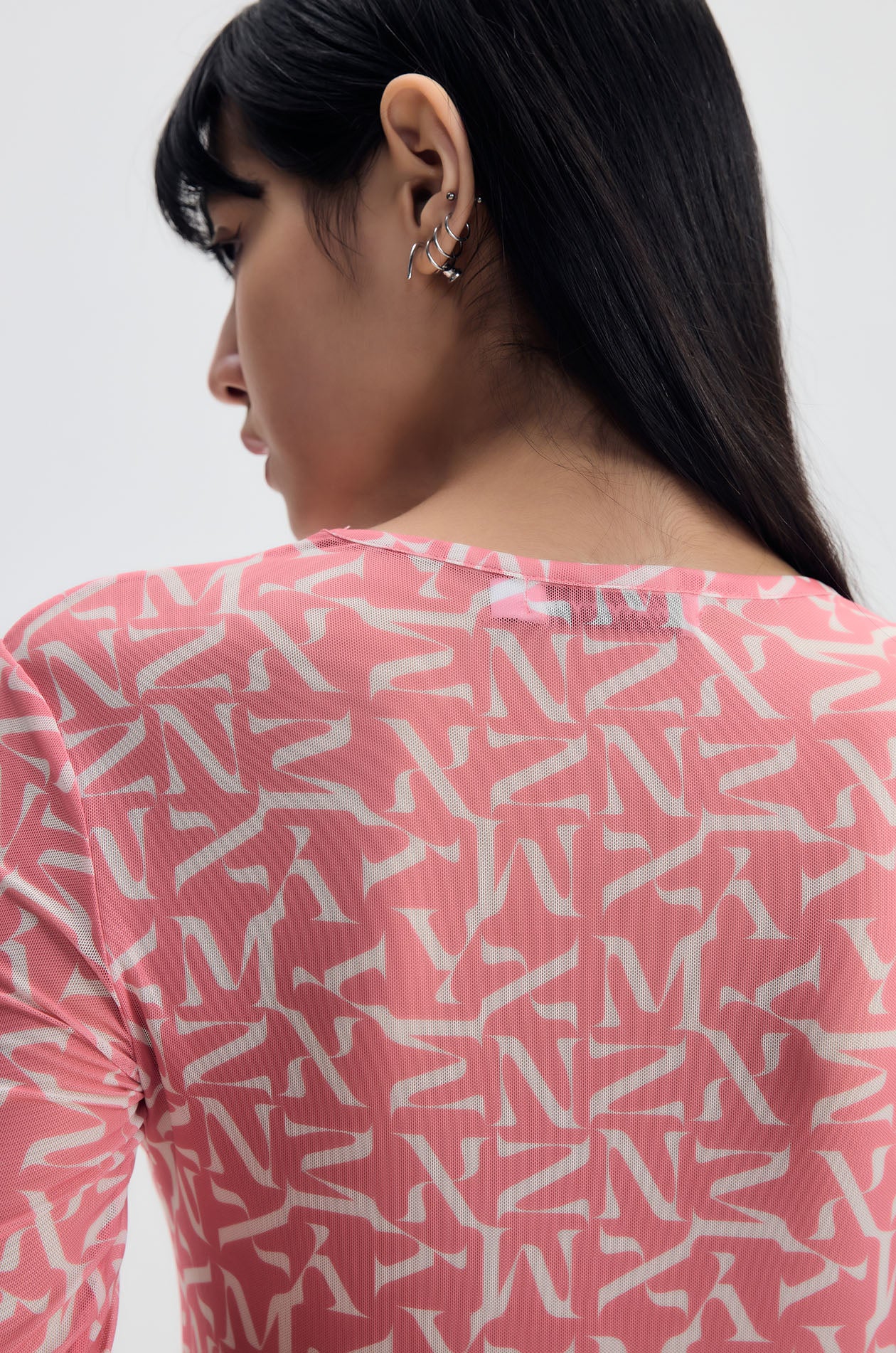 Long-sleeved second skin top in mesh with MM monogram print. Round neck and see-through effect without lining. Available in black, strawberry ice, and metal grey.
