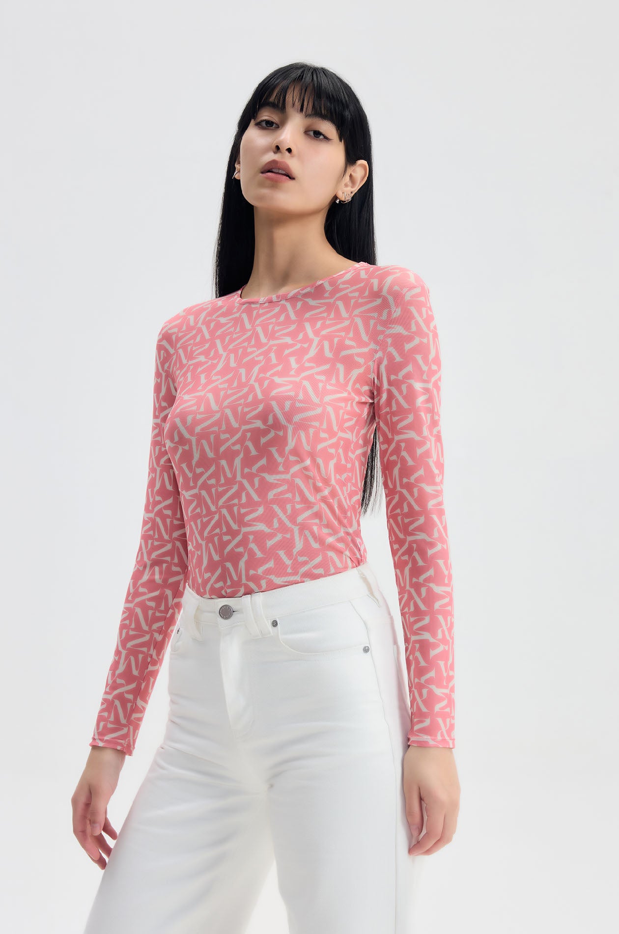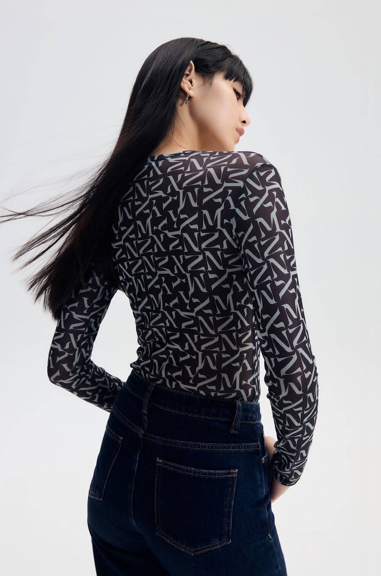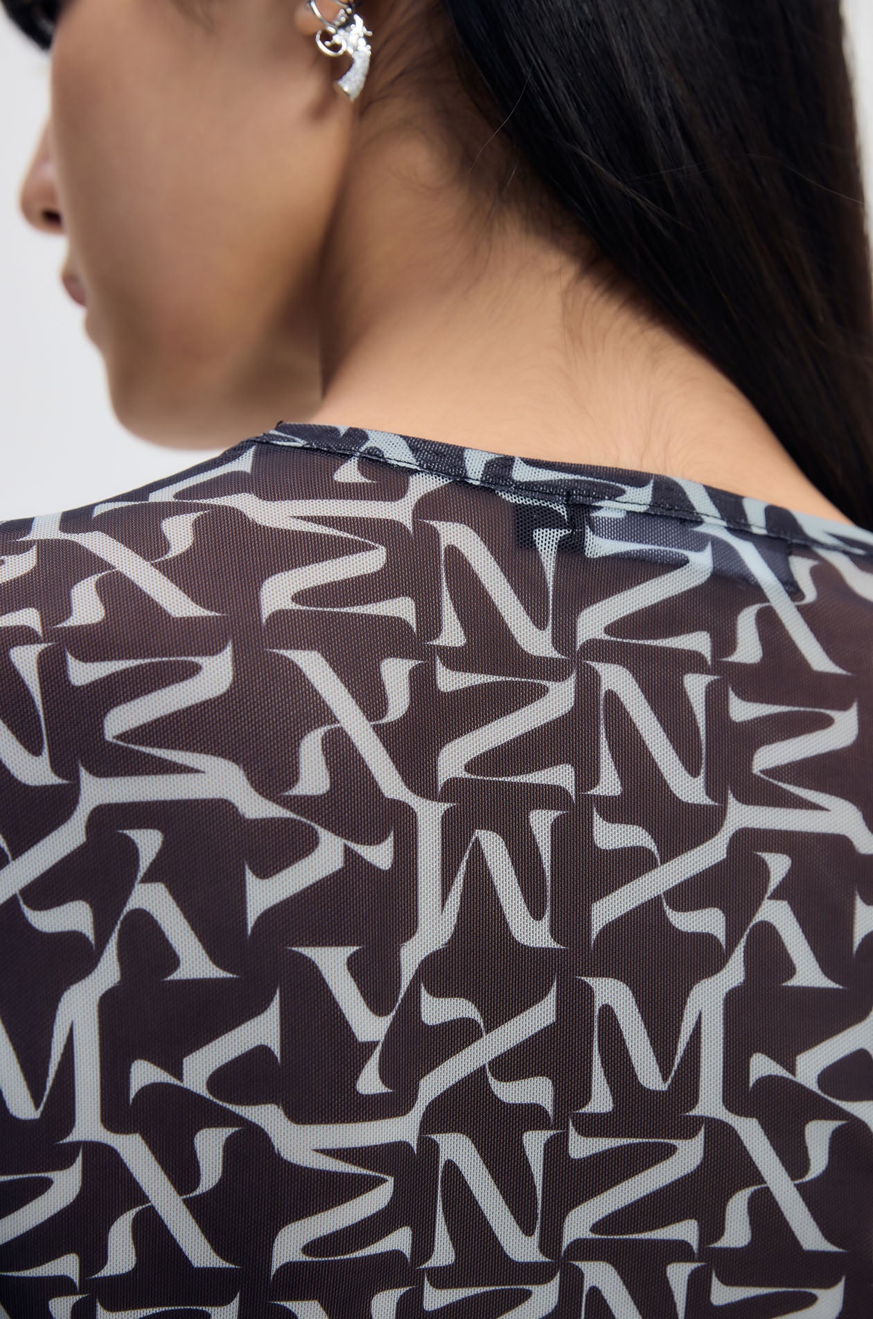 Long-sleeved second skin top in mesh with MM monogram print. Round neck and see-through effect without lining. Available in black, strawberry ice, and metal grey.