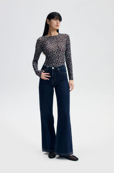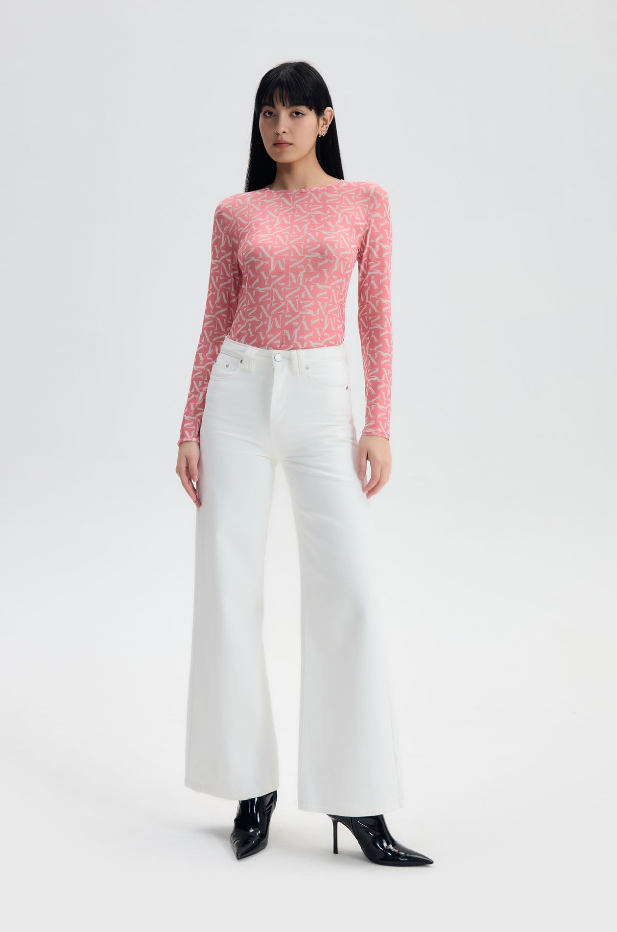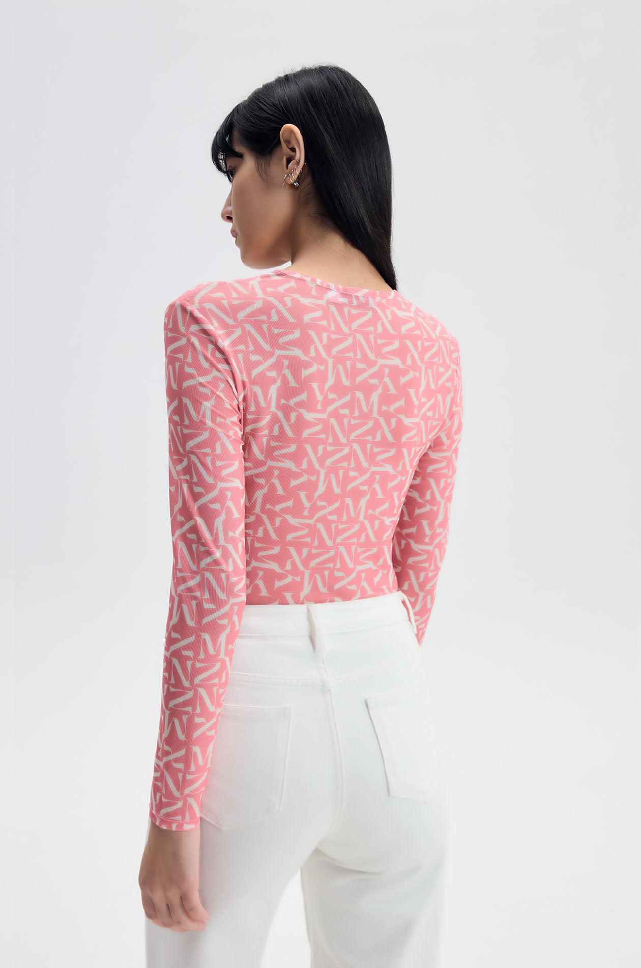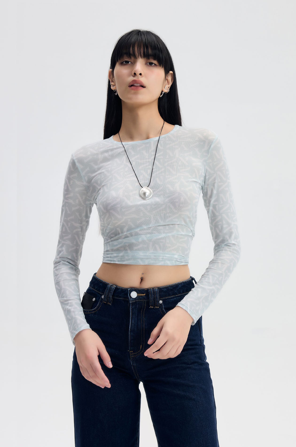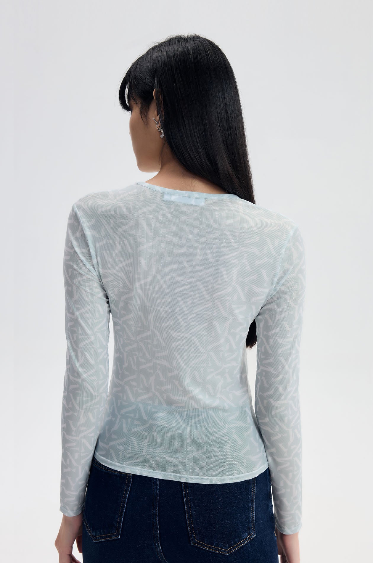 Long-sleeved second skin top in mesh with MM monogram print. Round neck and see-through effect without lining. Available in black, strawberry ice, and metal grey.