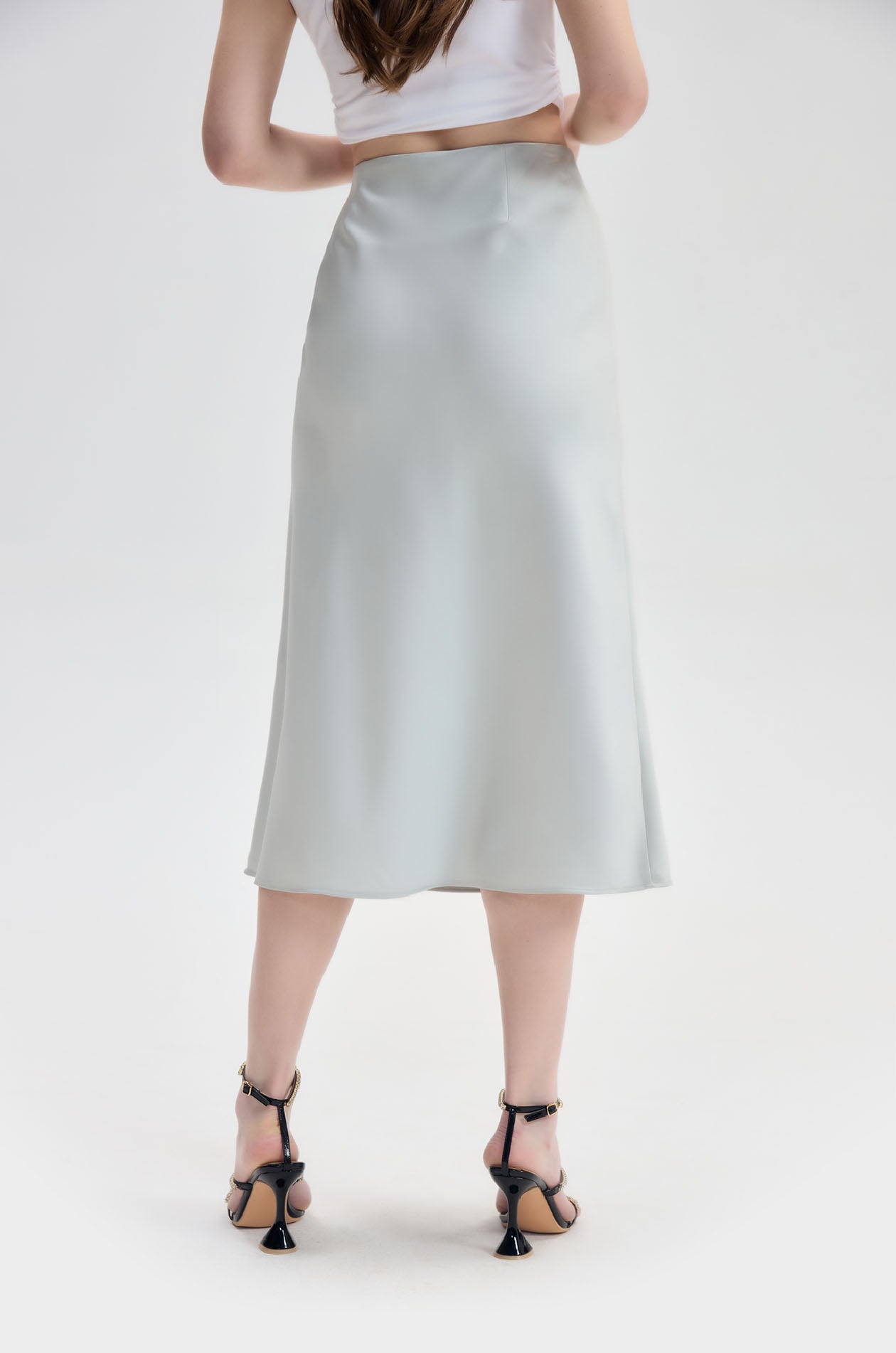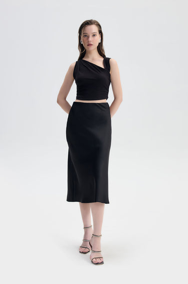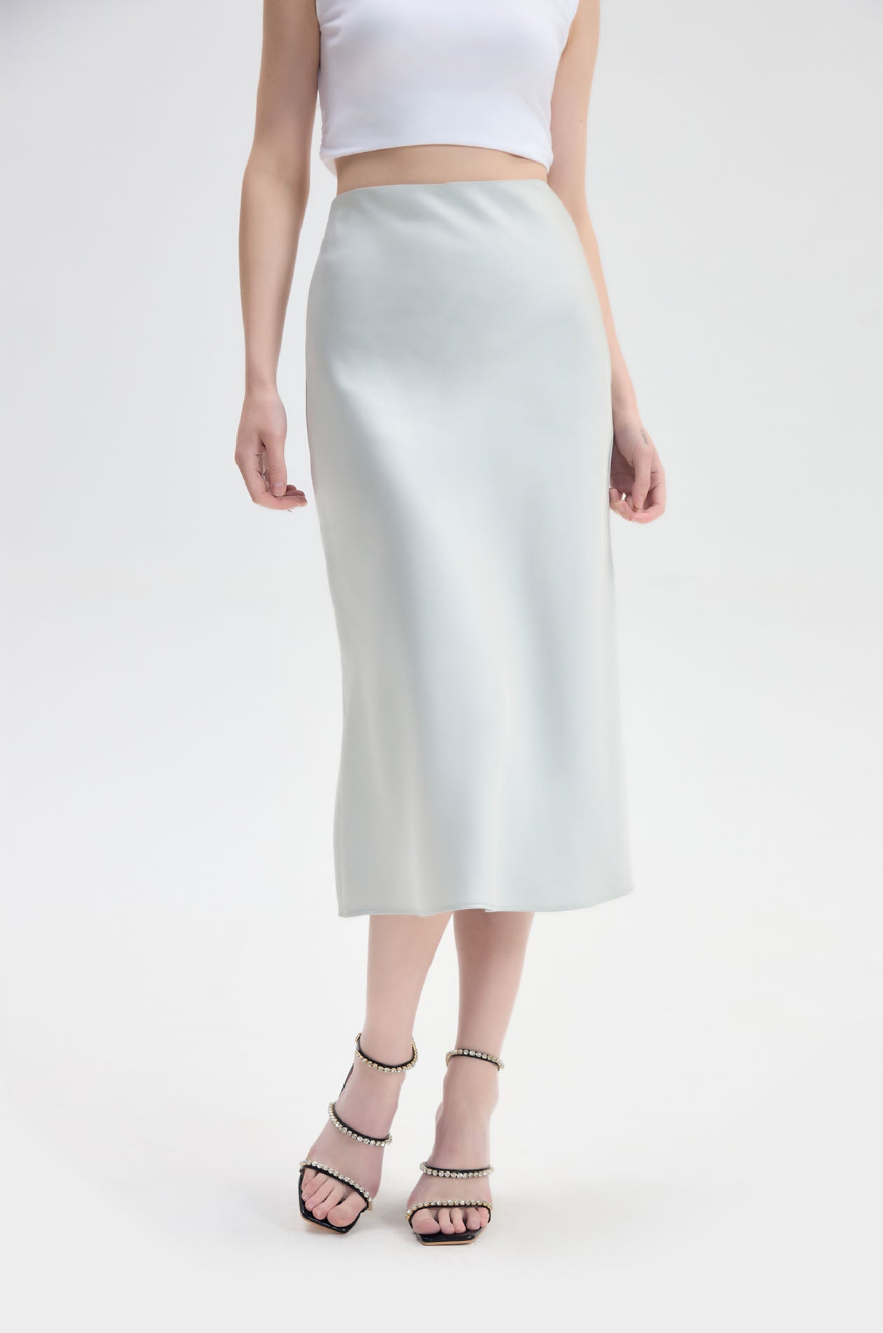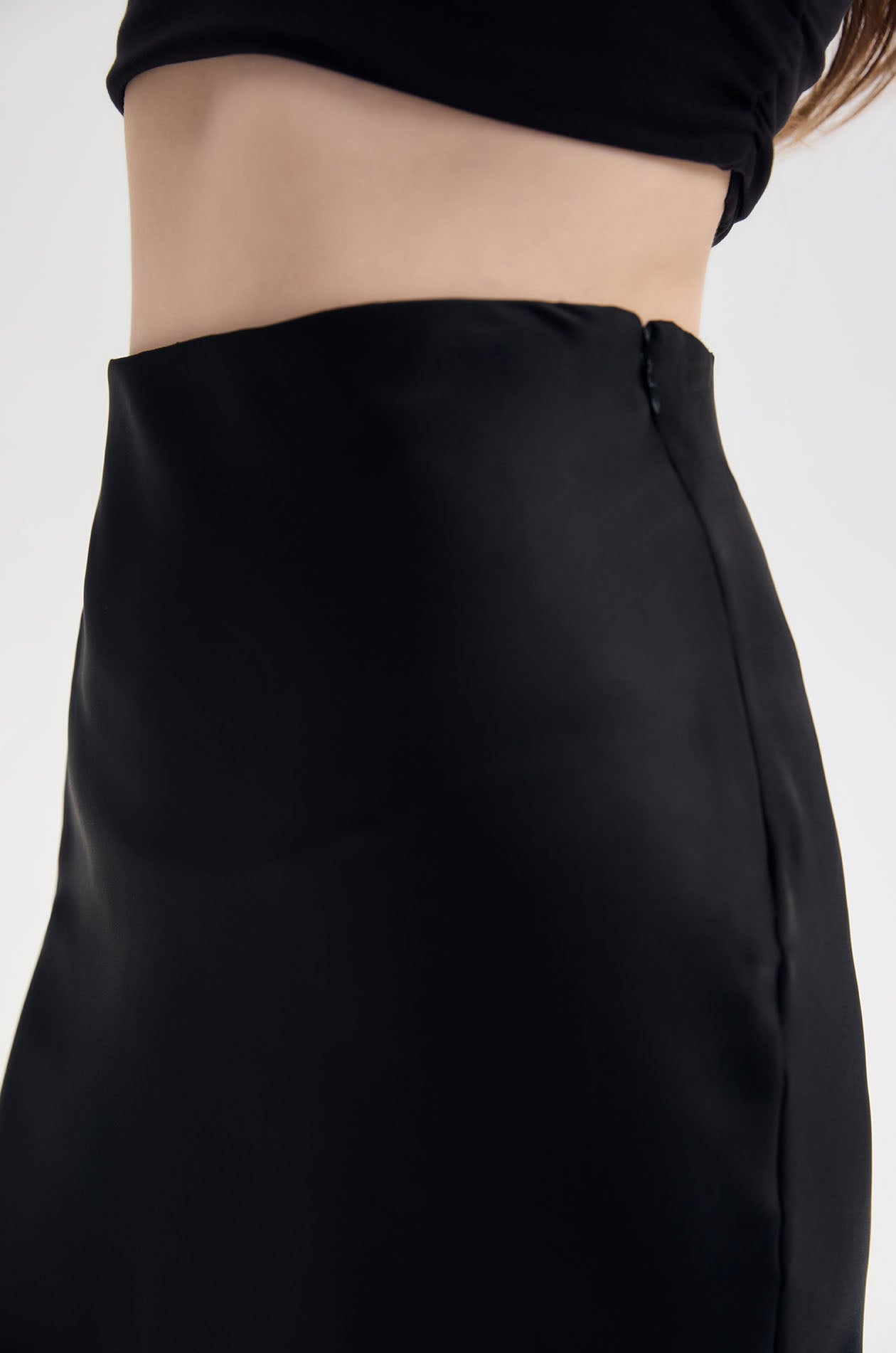 Mid-rise midi skirt in satin. Bias cut with elastic waistband and side zip closure. Available in black and metal grey.