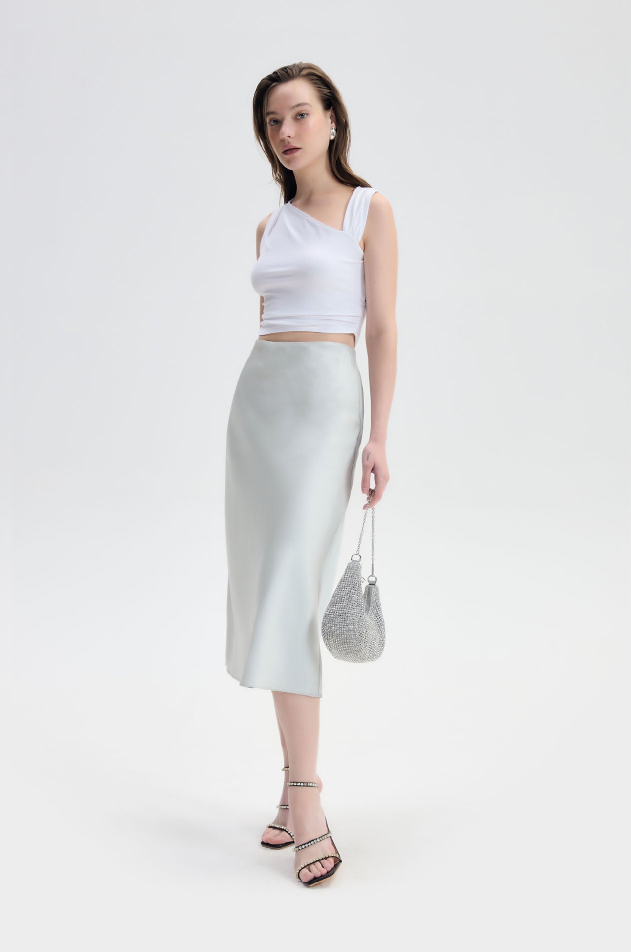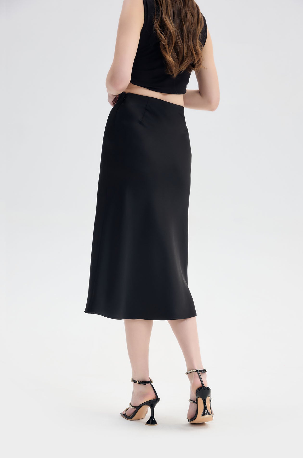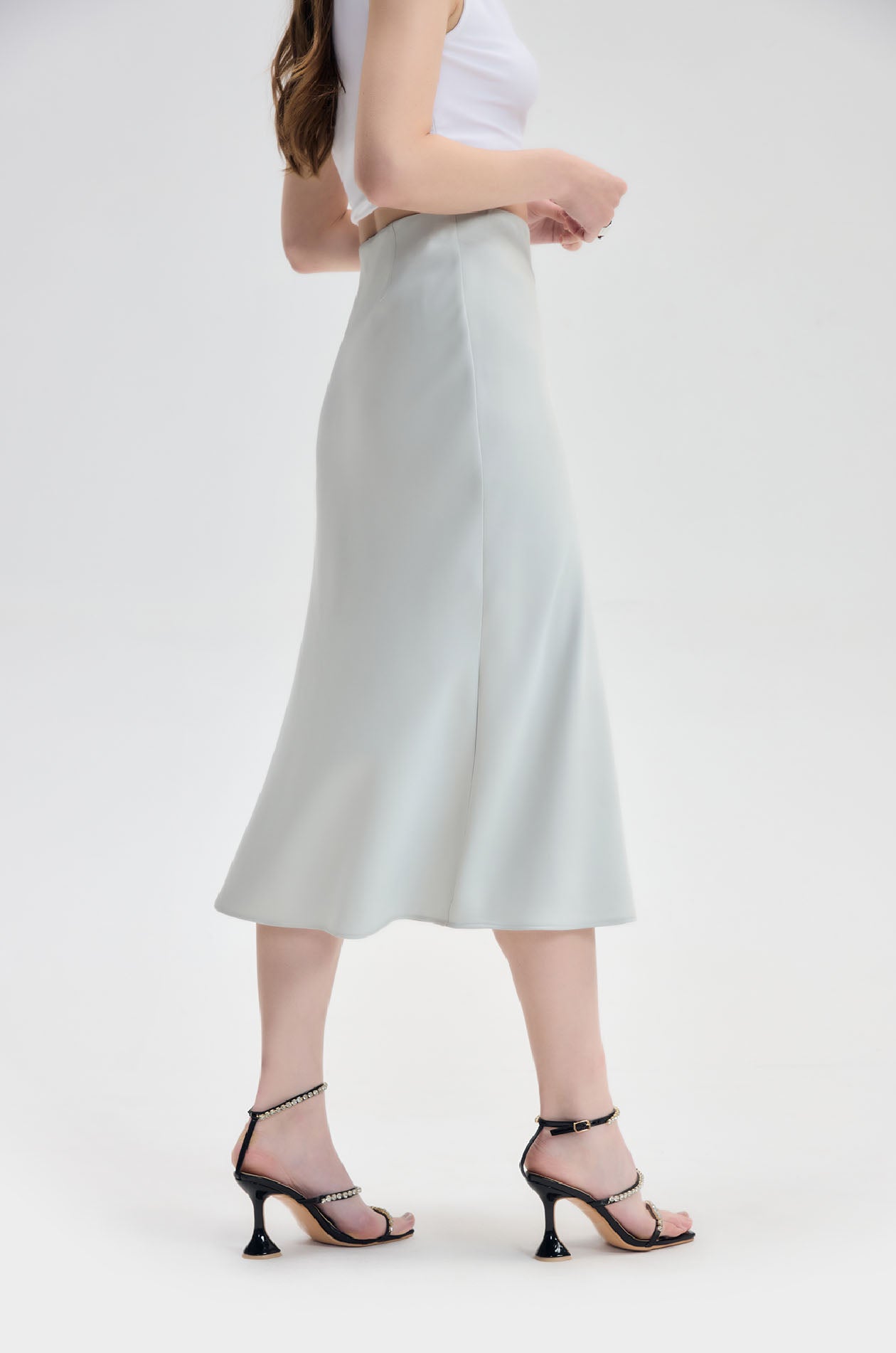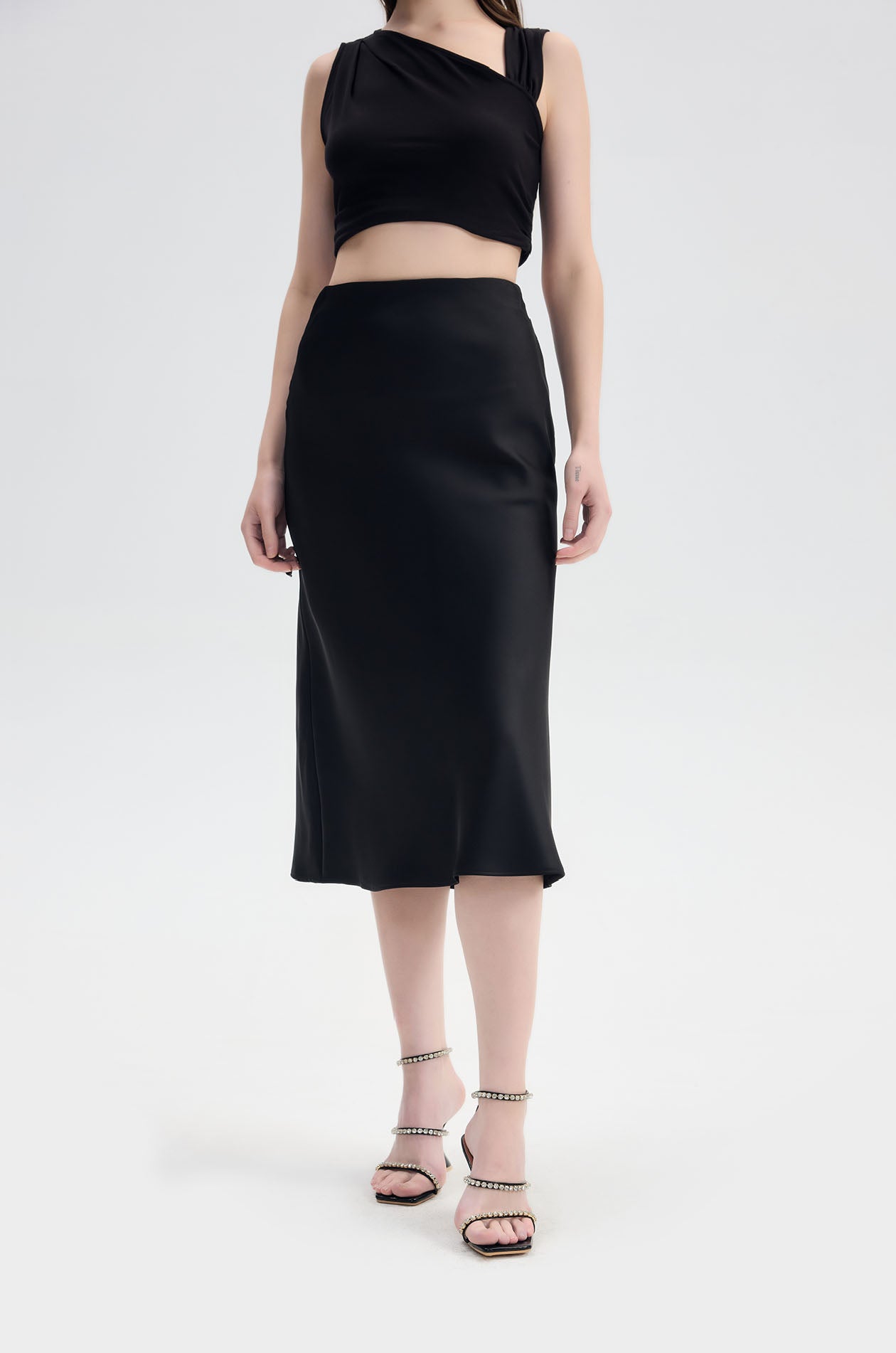 Mid-rise midi skirt in satin. Bias cut with elastic waistband and side zip closure. Available in black and metal grey.