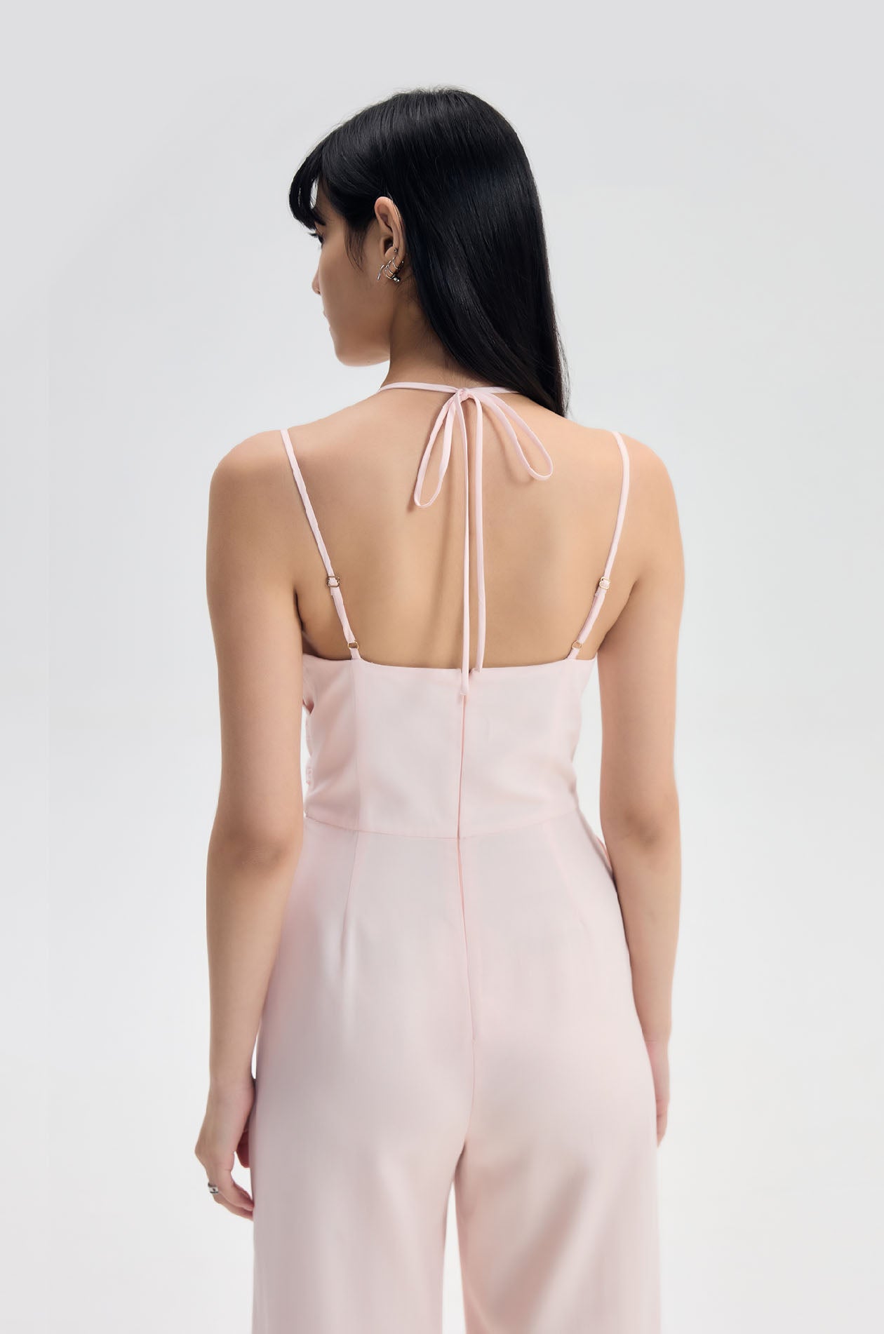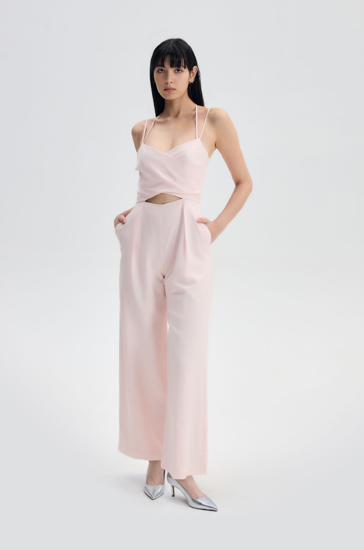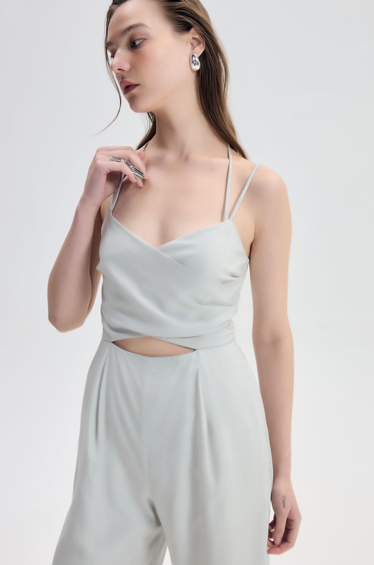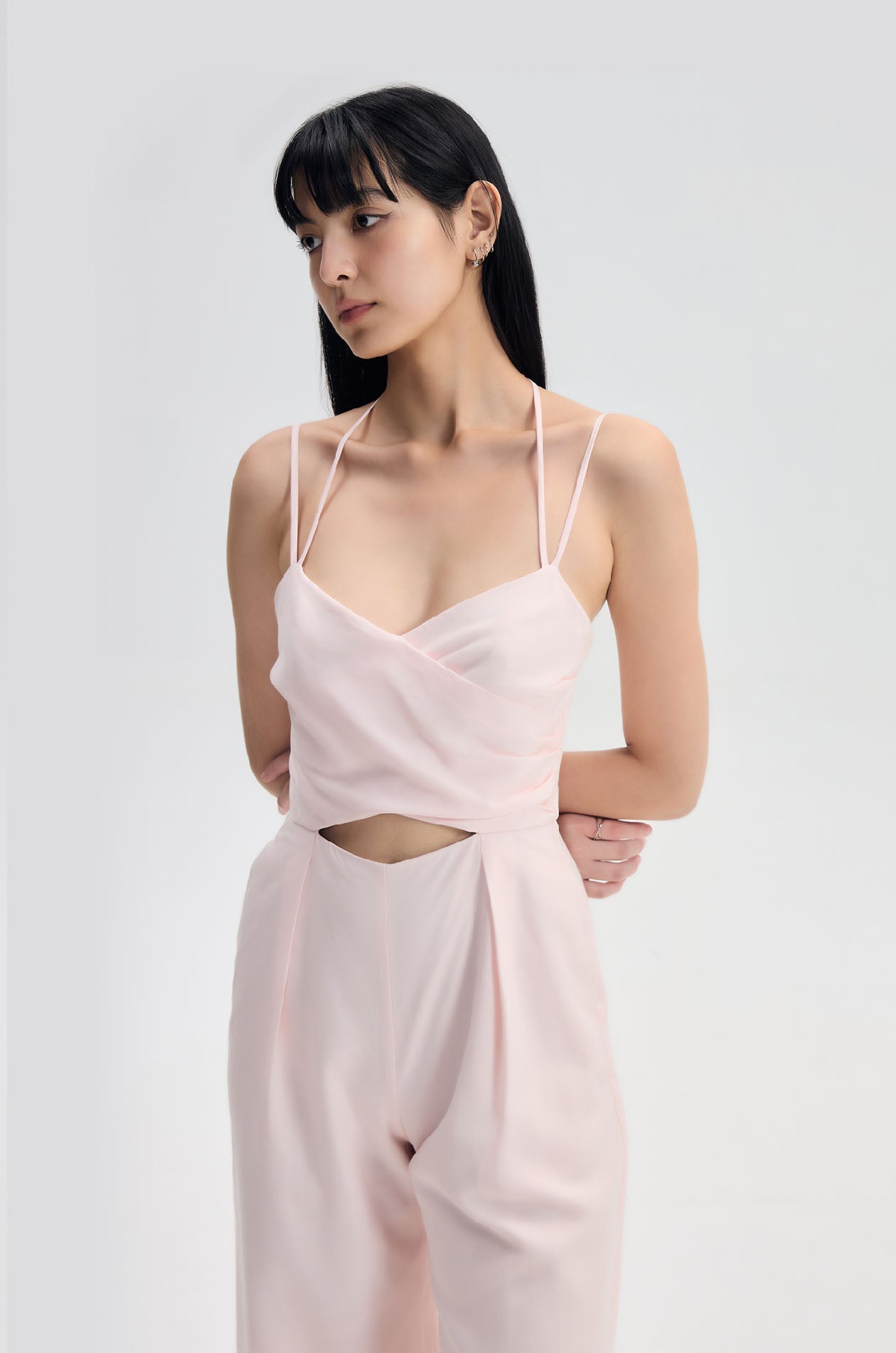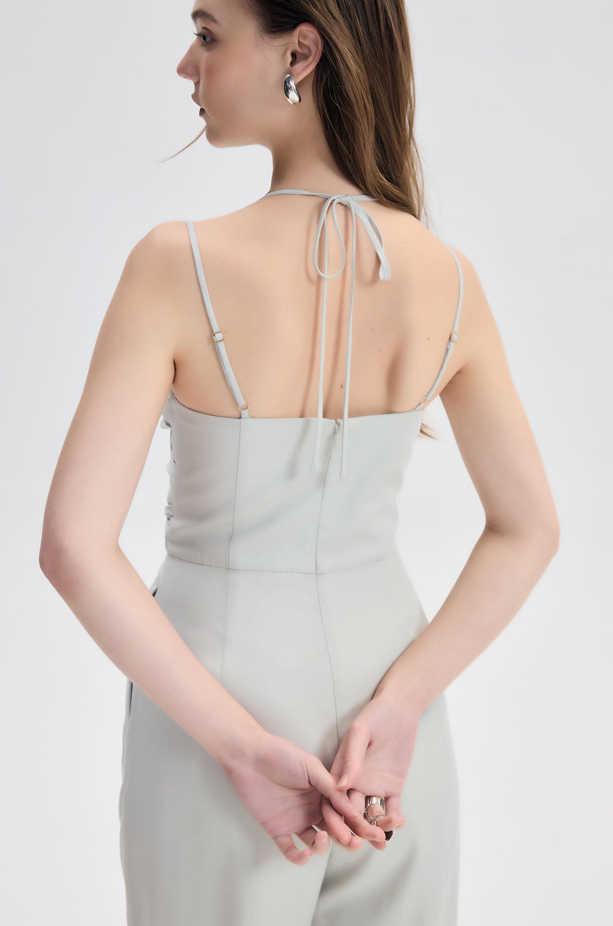 Strappy jumpsuit in textured fabric, crafted from sustainable lyocell and linen blend. Surplice neckline, adjustable camisole straps, halter neck tie, and cut-out detail at the waist. Wide legs with pleats and side pockets. Back zip closure. Available in metal grey and peach blush.
