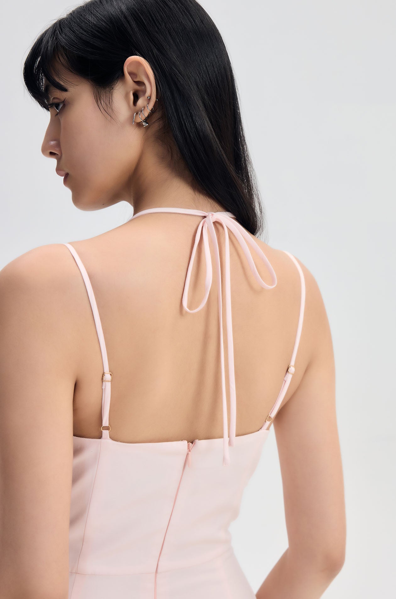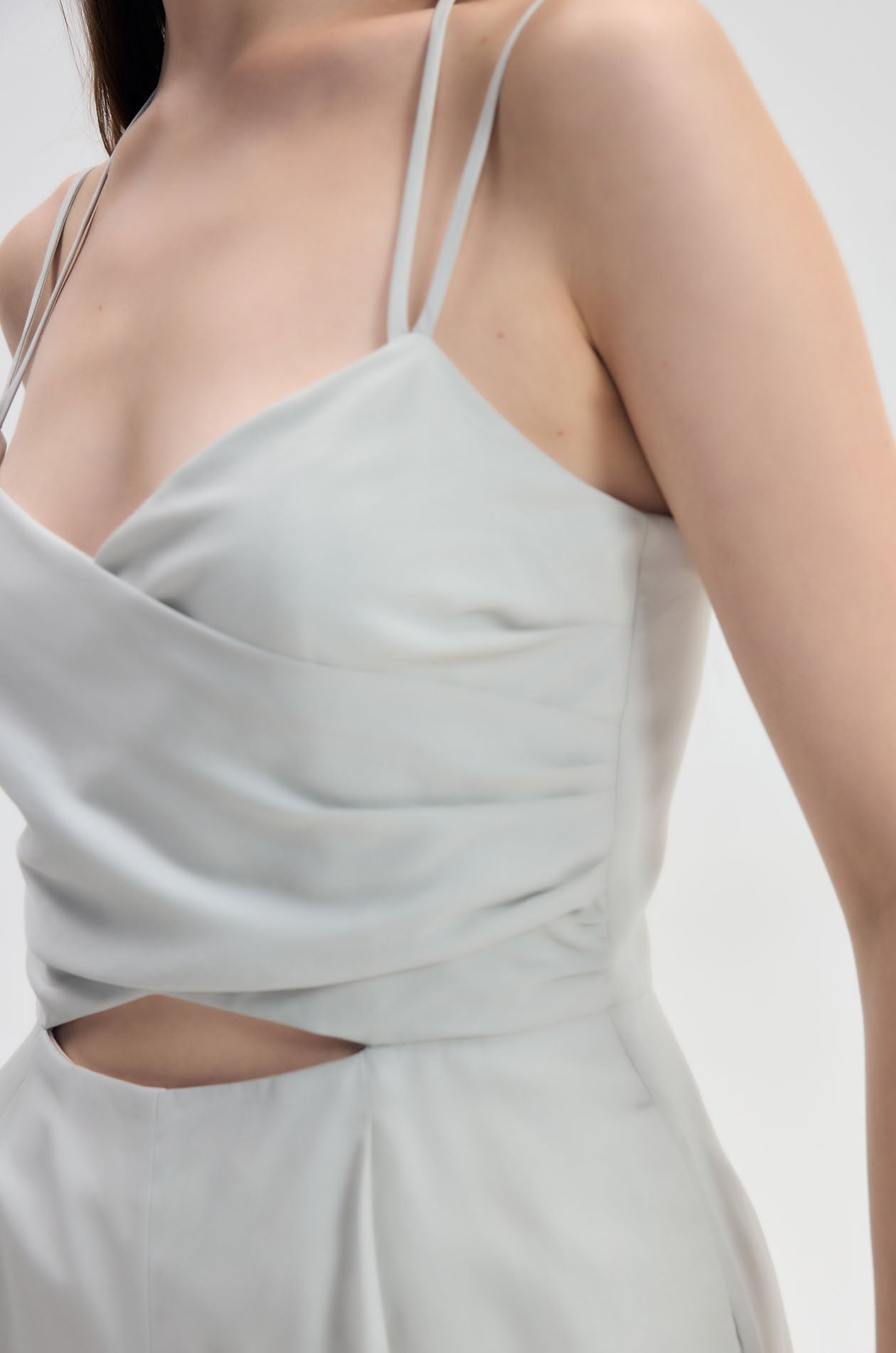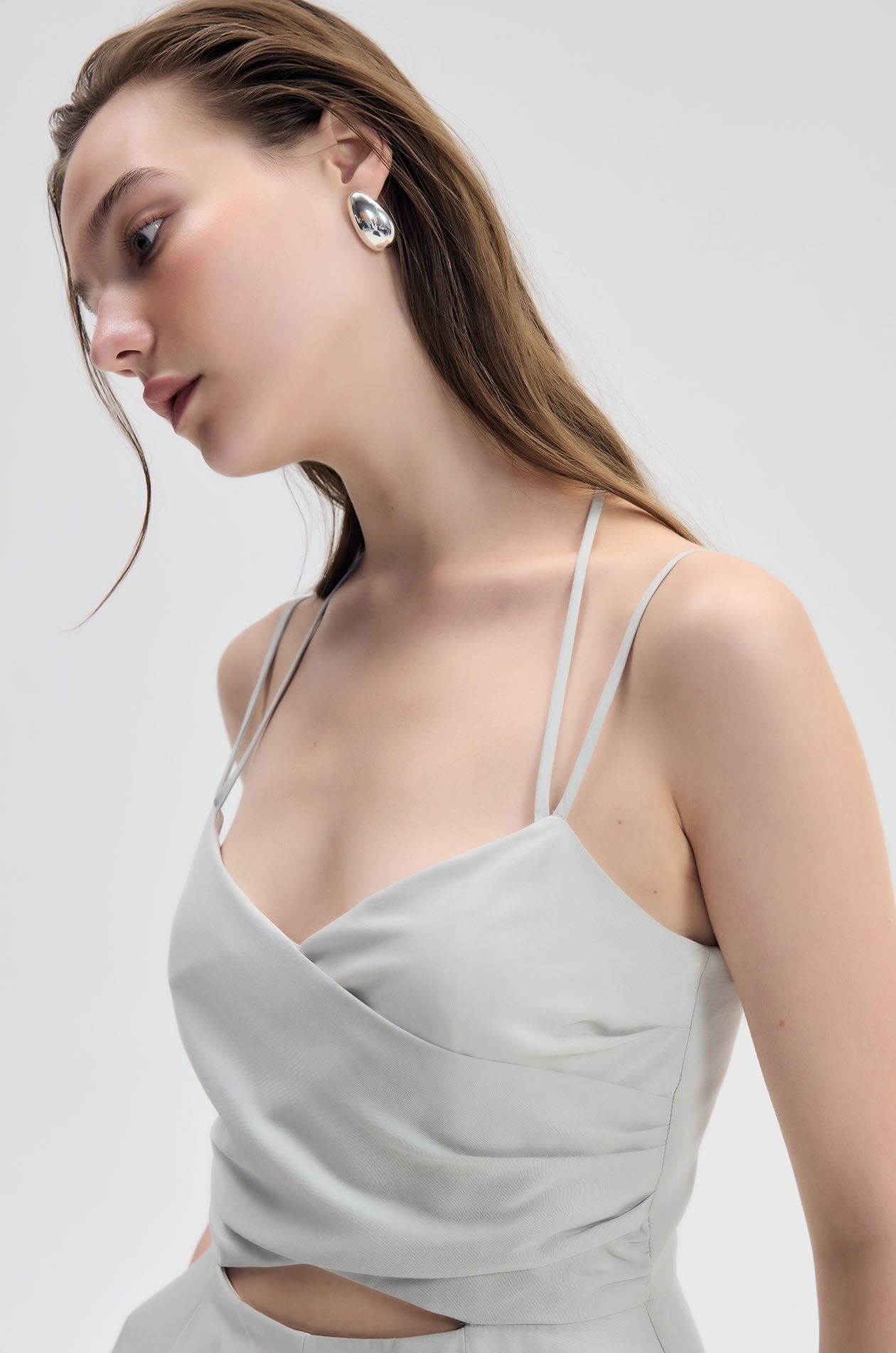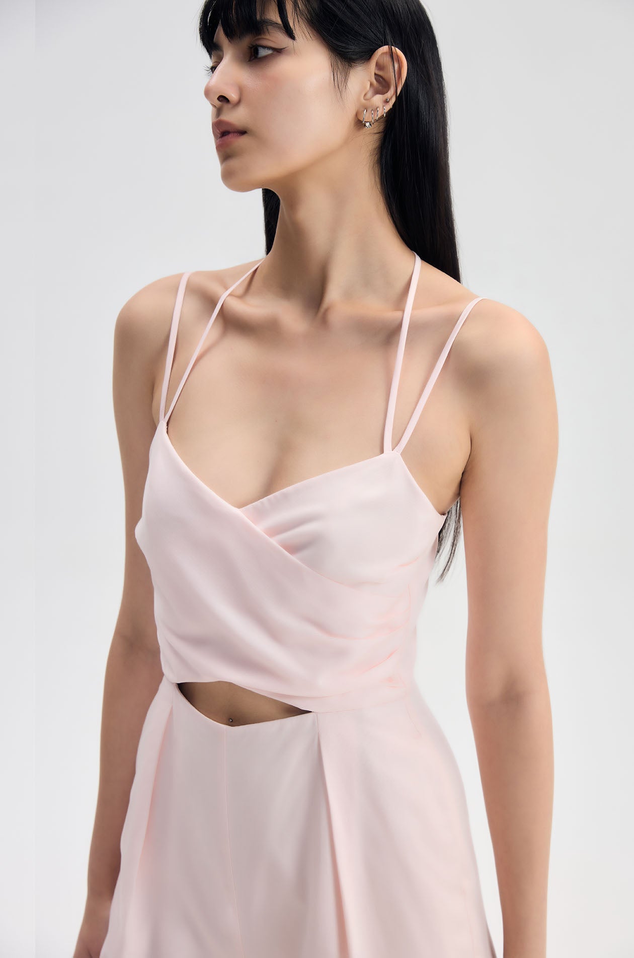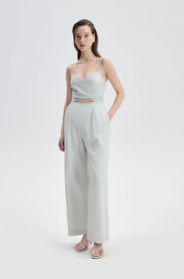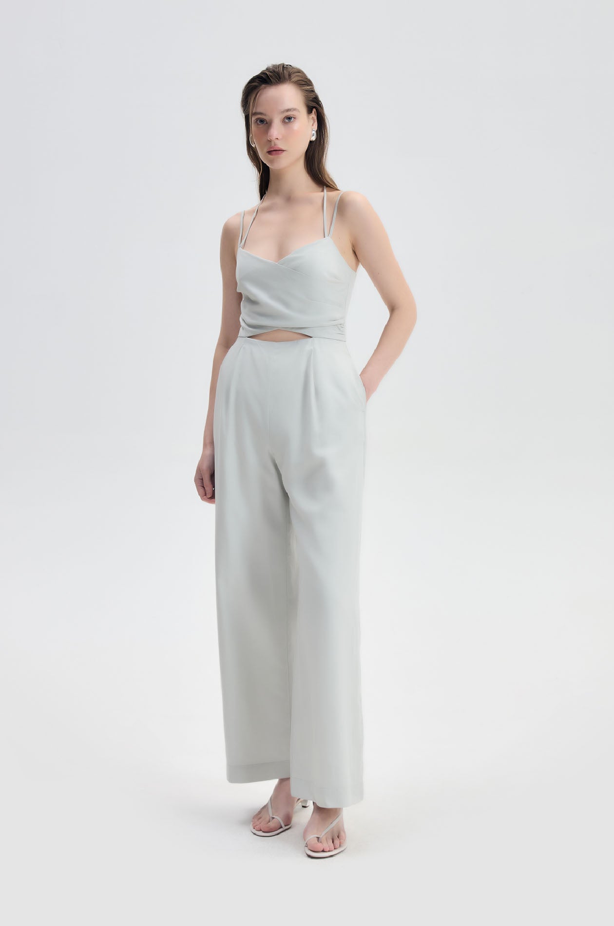 Strappy jumpsuit in textured fabric, crafted from sustainable lyocell and linen blend. Surplice neckline, adjustable camisole straps, halter neck tie, and cut-out detail at the waist. Wide legs with pleats and side pockets. Back zip closure. Available in metal grey and peach blush.