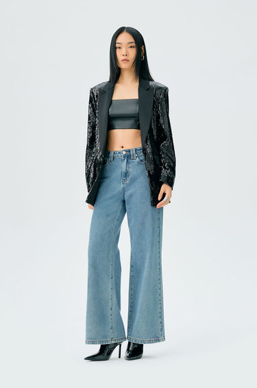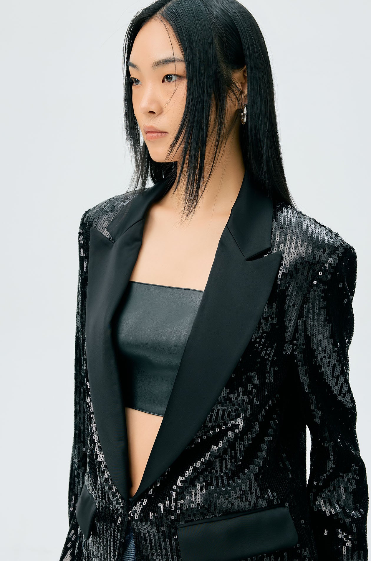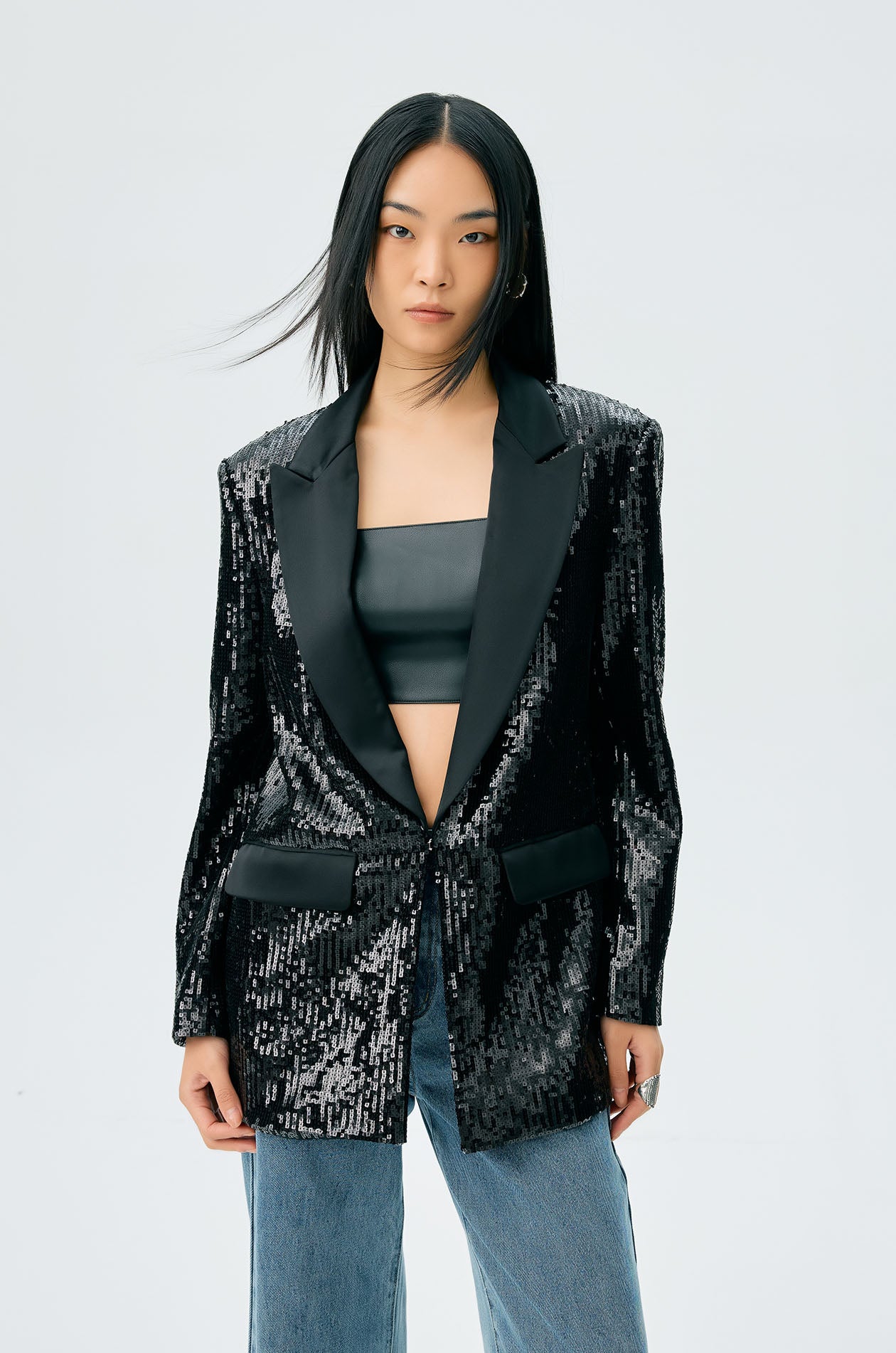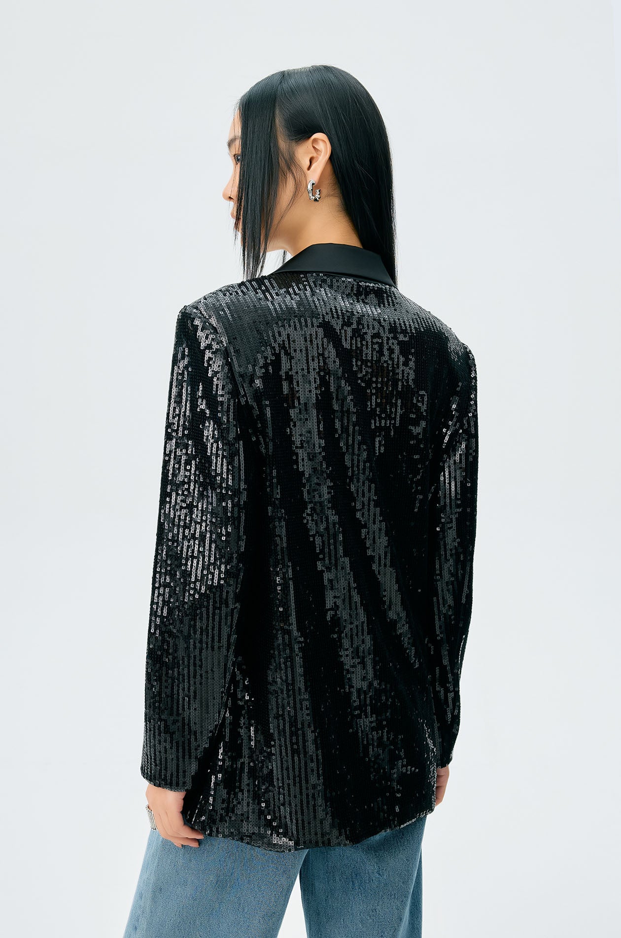 Single-breasted blazer in lightweight fabric with satin trim. Allover sequins embellishment. Peak lapel, padded shoulders, and front pockets. Front hook closure. Available in black.