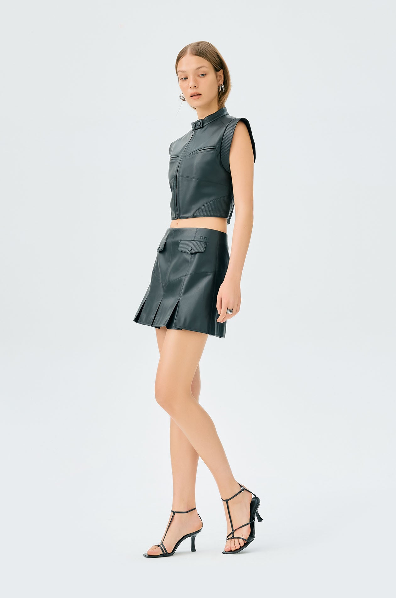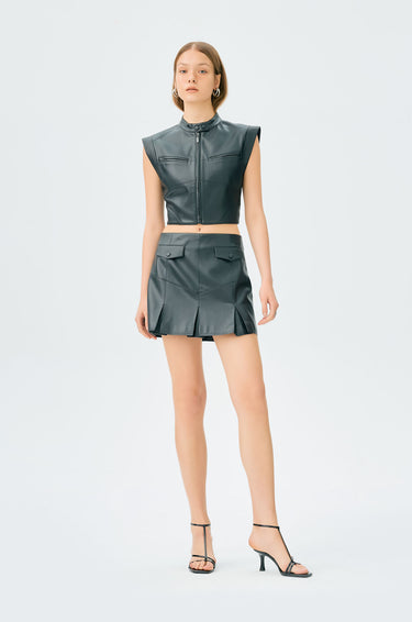 Mid-rise mini skirt in smooth faux leather. Drop waist silhouette with invert box pleats and faux pockets. Back zip closure. Available in black.