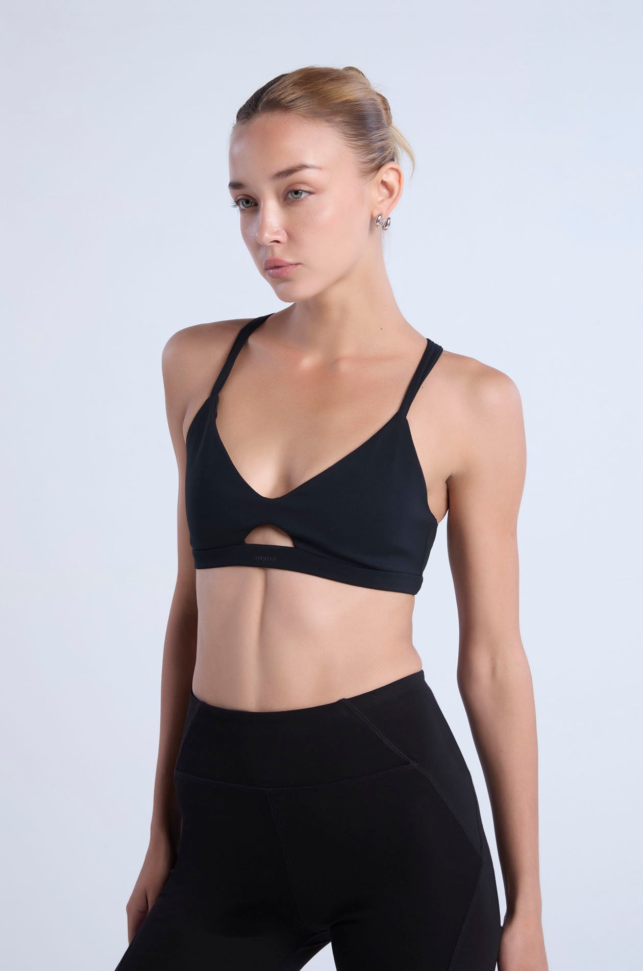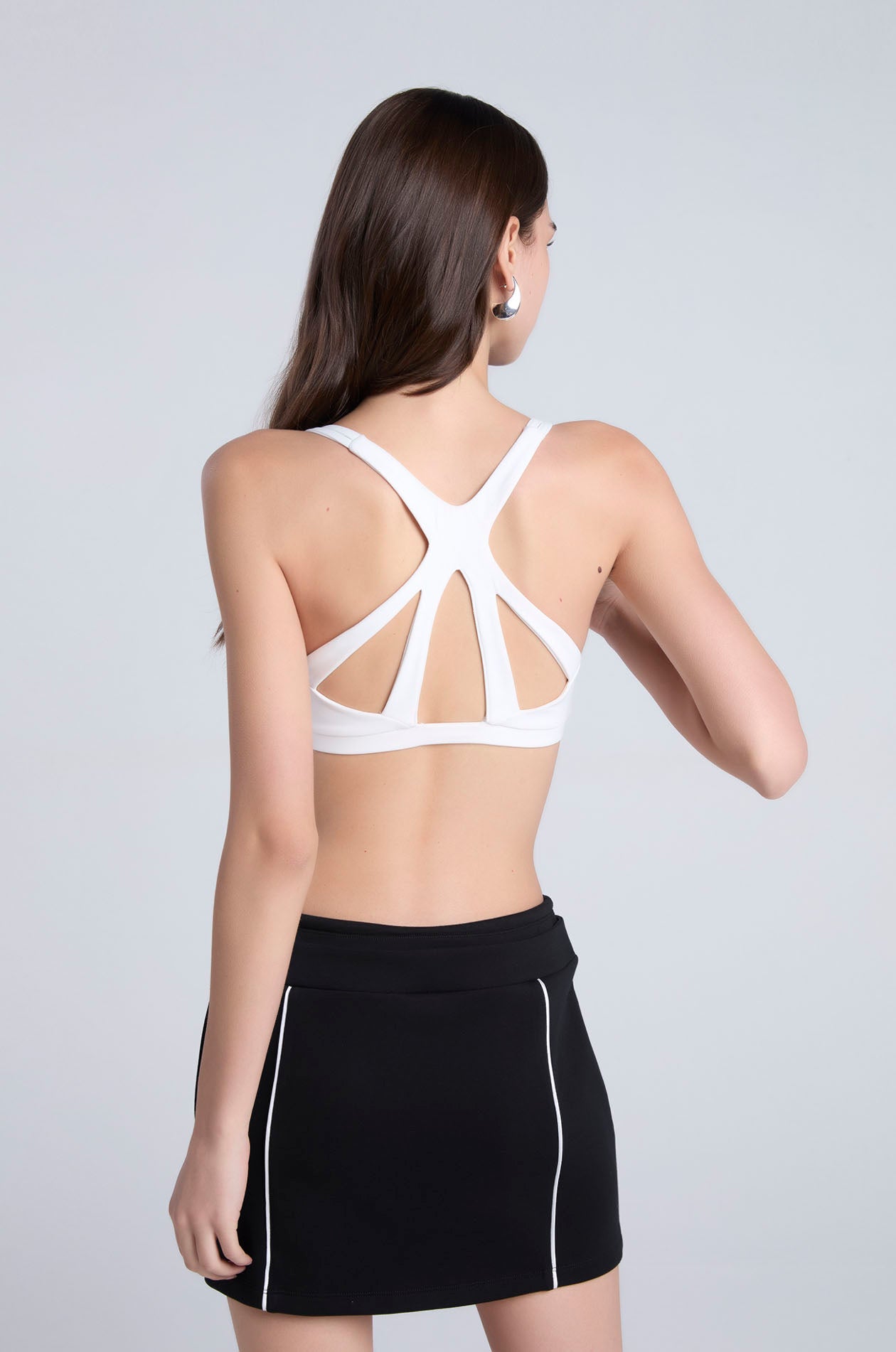 Strappy bra top in stretchy interlock fabric. Features triangle padded cups, a front cut-out, and a lettering logo detail. The back panel is designed with multiple skinny straps for an intricate, statement look. Available in black and white.