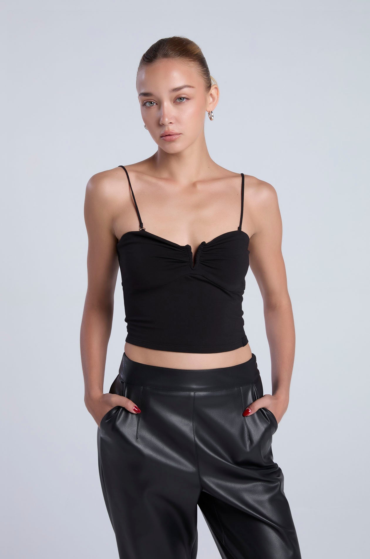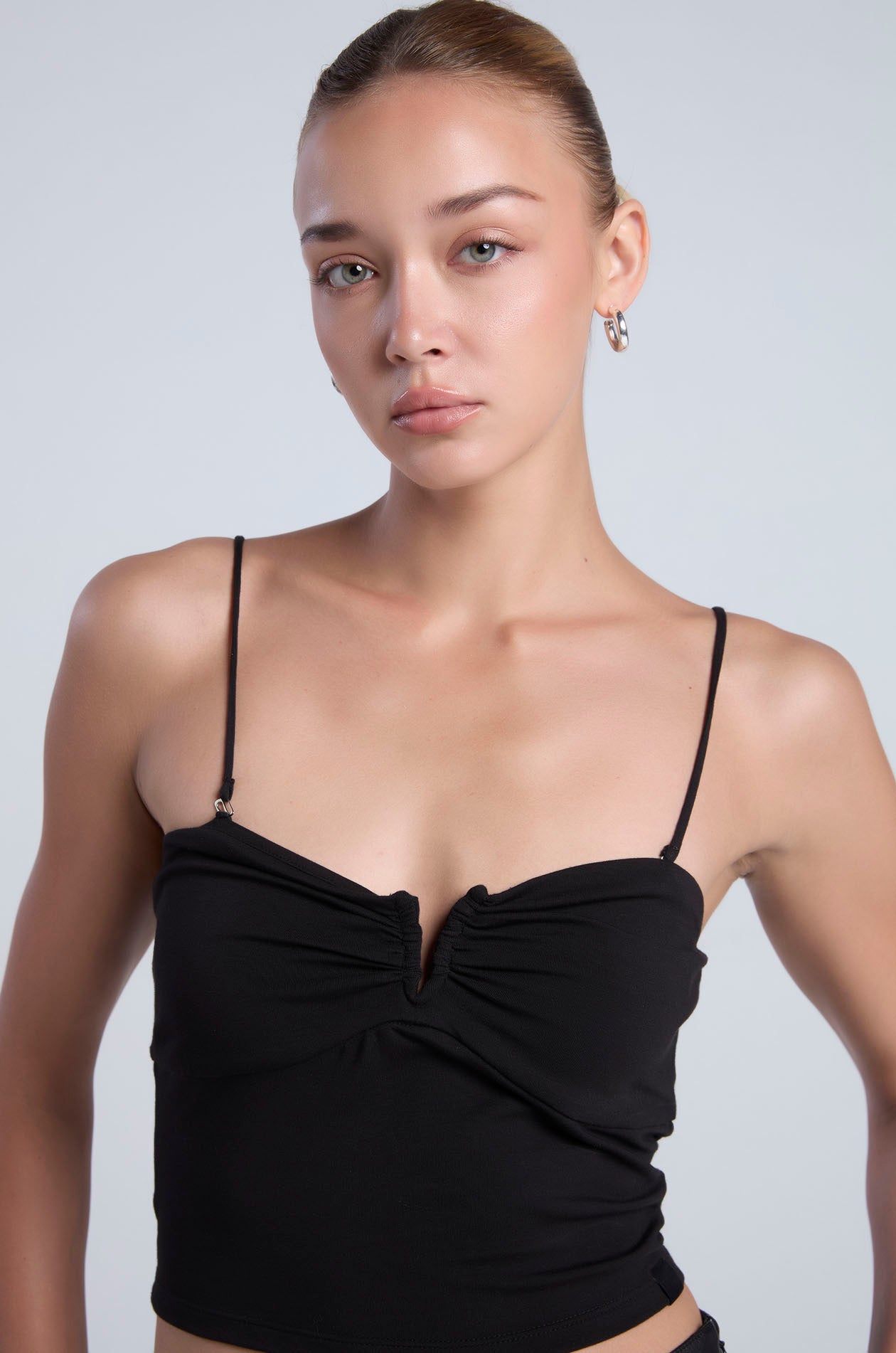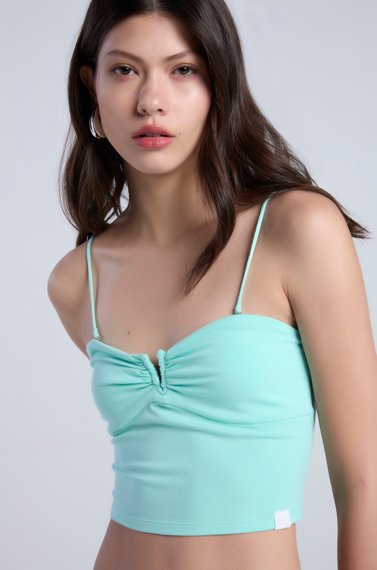 Strapless tube top in soft-finish jersey. Bandeau neckline with cut-out and ruched detailing. Includes removable straps for versatile styling options. Available in Ice Green, black, and white.