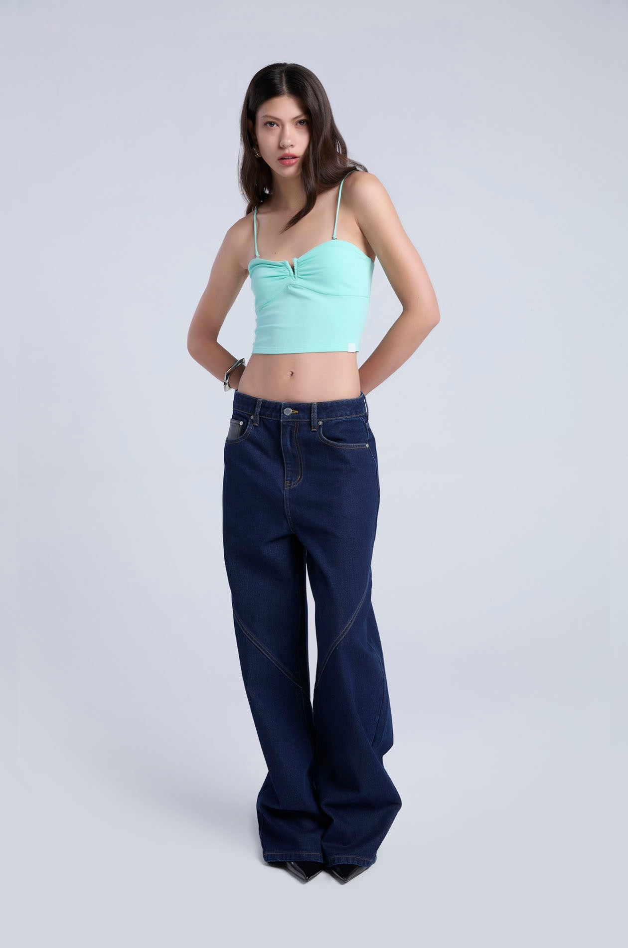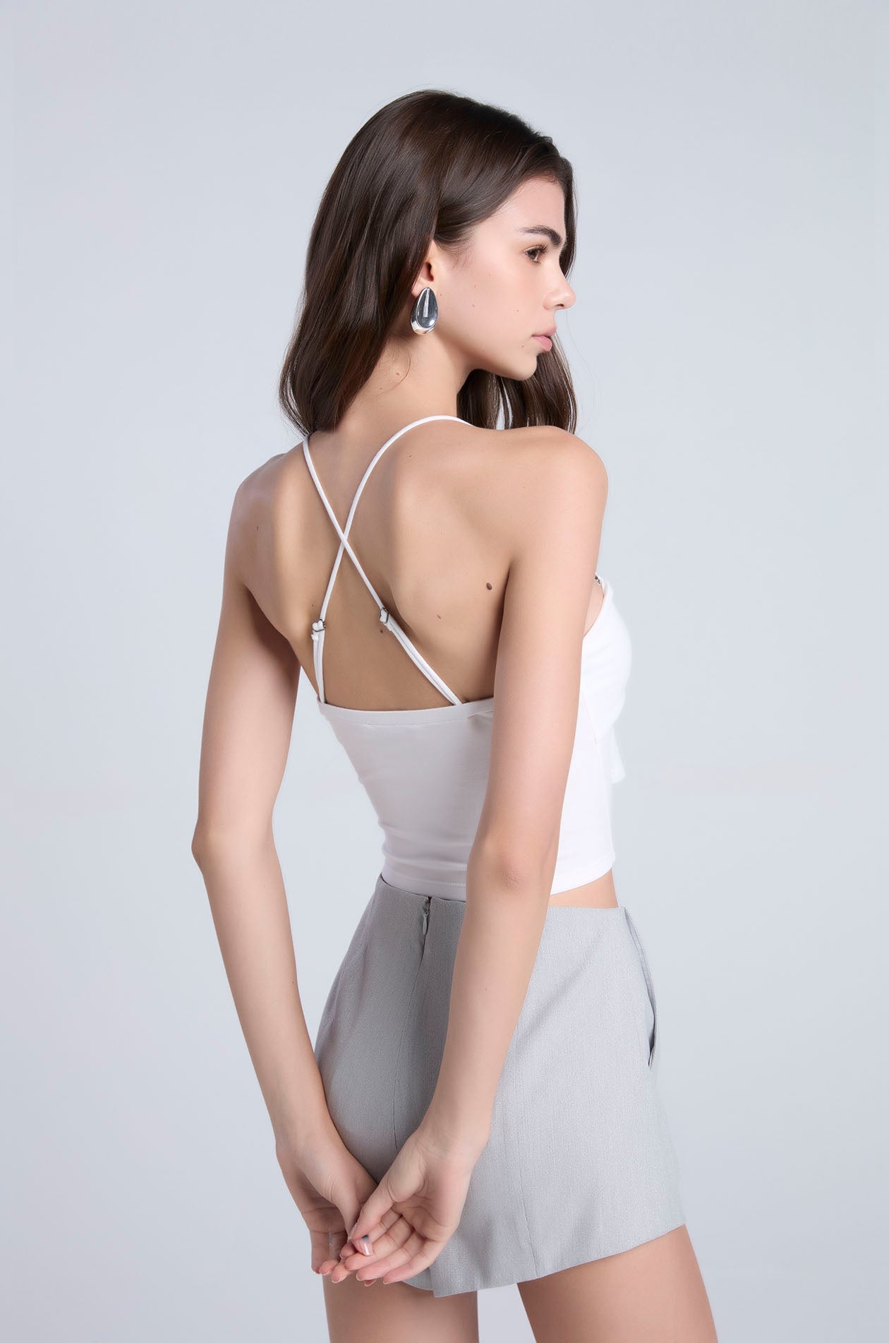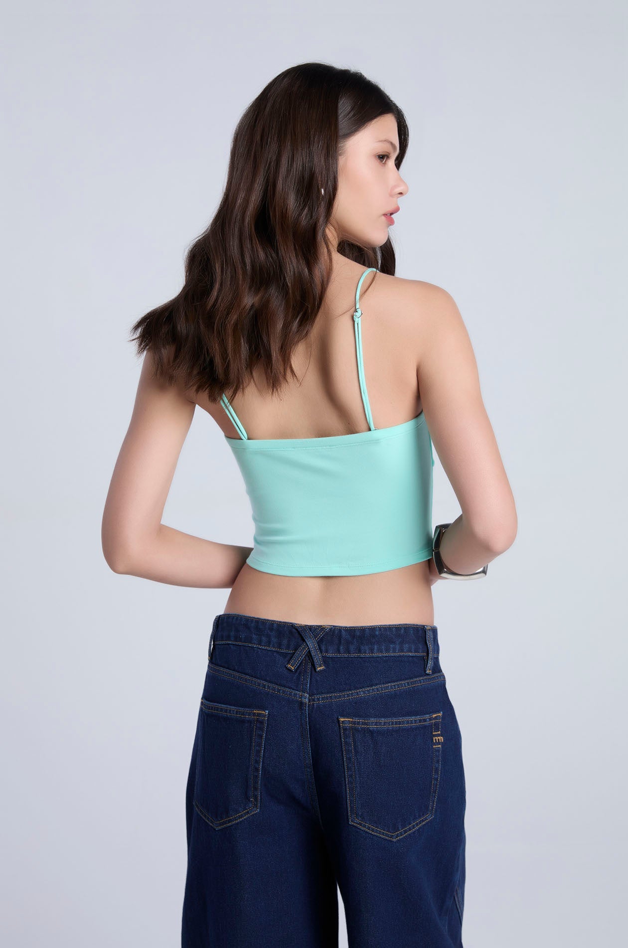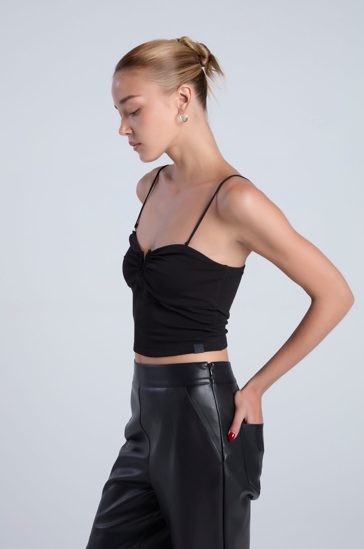 Strapless tube top in soft-finish jersey. Bandeau neckline with cut-out and ruched detailing. Includes removable straps for versatile styling options. Available in Ice Green, black, and white.