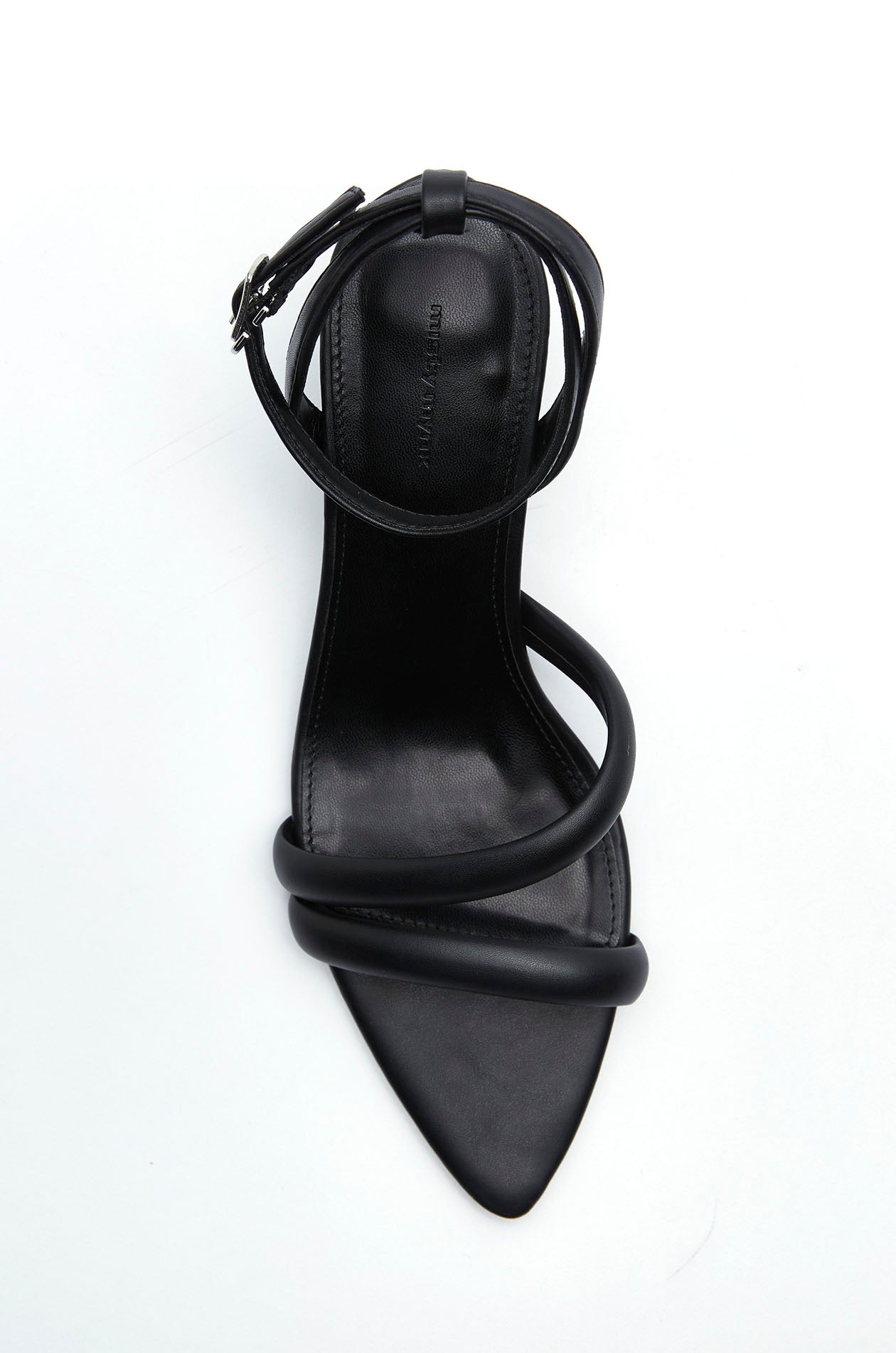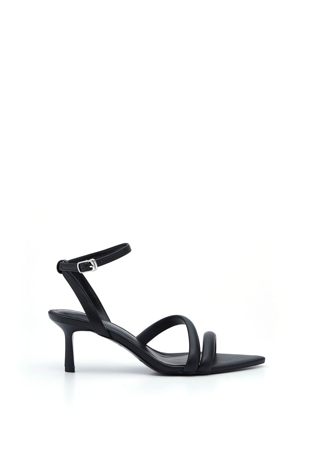 Pointed-toe sandals crafted from faux leather, featuring delicate skinny straps and mid-height heels. Available in black.